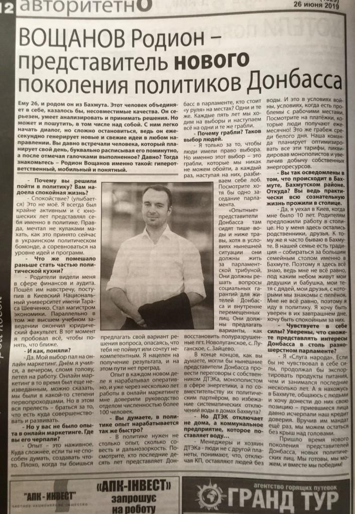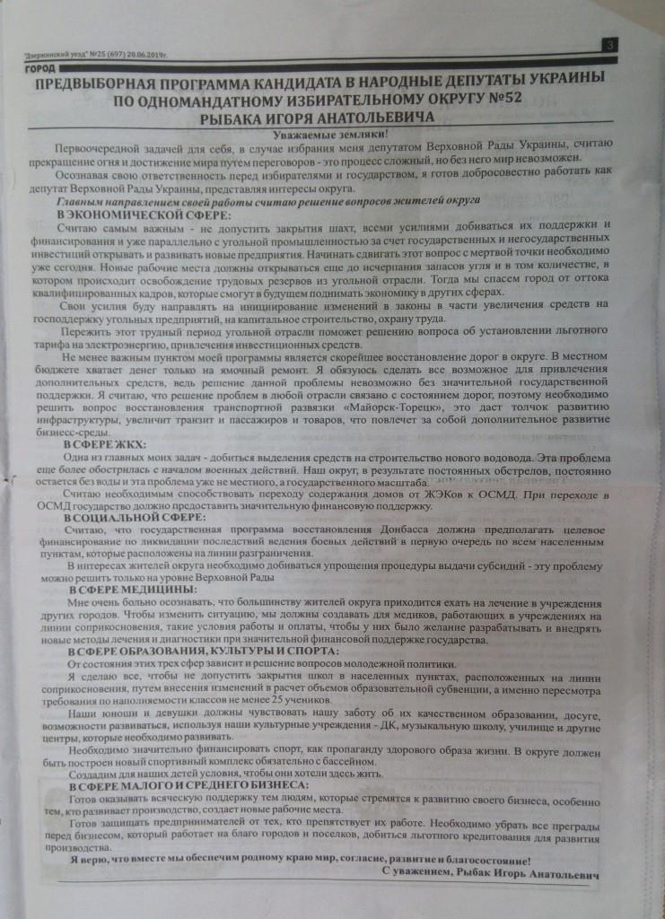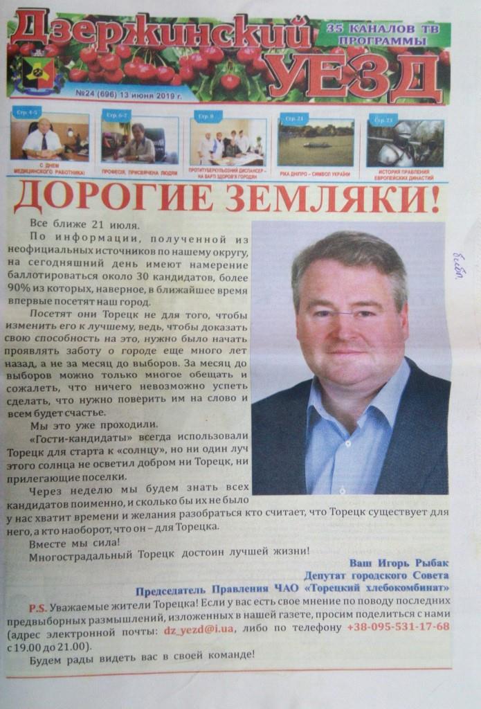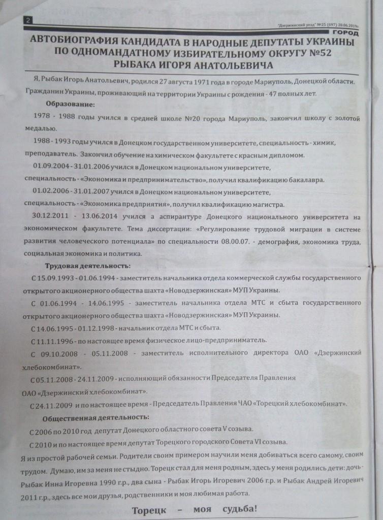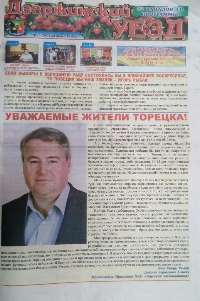 Щодо кандидатів, які балотуються до Верховної Ради за мажоритарним списком, про таких у регіональних газетах впродовж червня писали неодноразово. Три випуски поспіль обкладинку друкованого видання прикрашав Ігор Рибак, кандидат від 52 округу, безпартійний. Наразі він є чинним депутатом міської ради у місті Торецьк. Інформація про його автобіографію, діяльність, передвиборчу програму й плани на майбутнє тричі публікувалась у трьох випусках поспіль й за обсягом займала більшу половину матеріалу у примірнику.