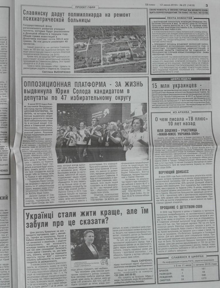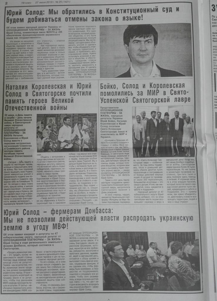 Юрій Солод, кандидат у депутати від «Опозиційної платформи – За життя» по ОВК № 47 фігурує у ЗМІ разом із партійними колегами Наталією Королевською та Юрієм Бойком. Про візит до Святогірської Лаври з молитвою «за мир», заяви щодо скасування мовного закону зазначені на одній сторінці трьома окремими публікаціями, проте без належного маркування. Ще одна публікація з ознаками «джинсами» на користь кандидата від ОВК 47 Юрія Солода прикрашає сторінку газети поряд зі зверненням Надії Савченко, теж без маркування. Такі матеріали можуть носити ознаки прихованої політичної реклами.