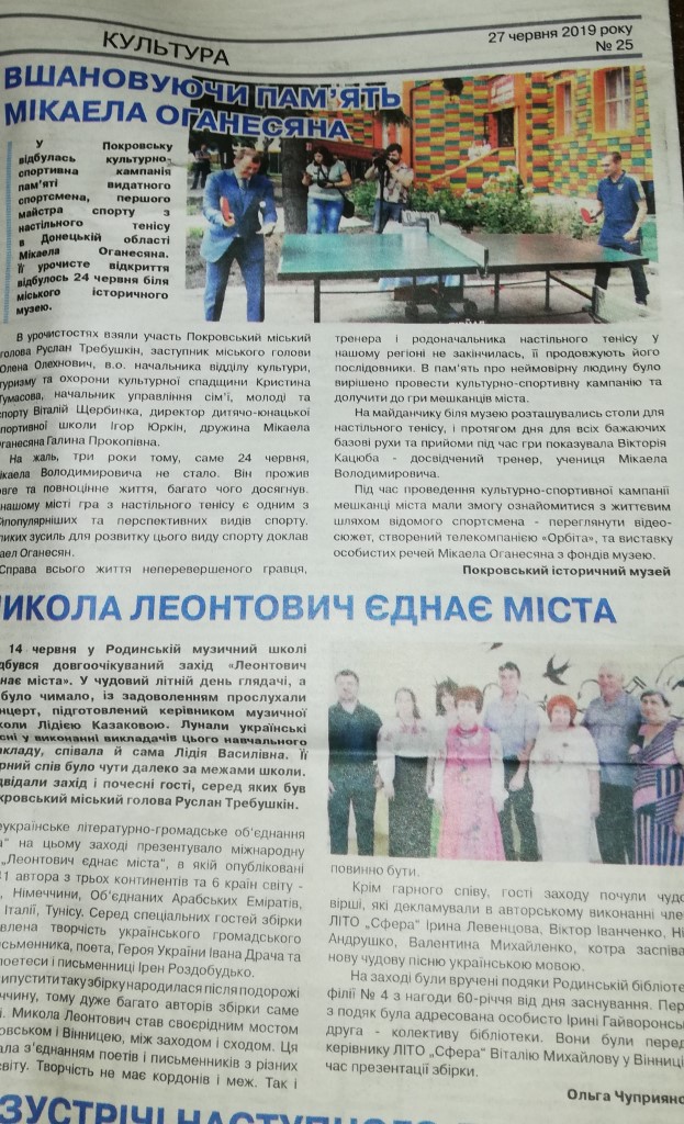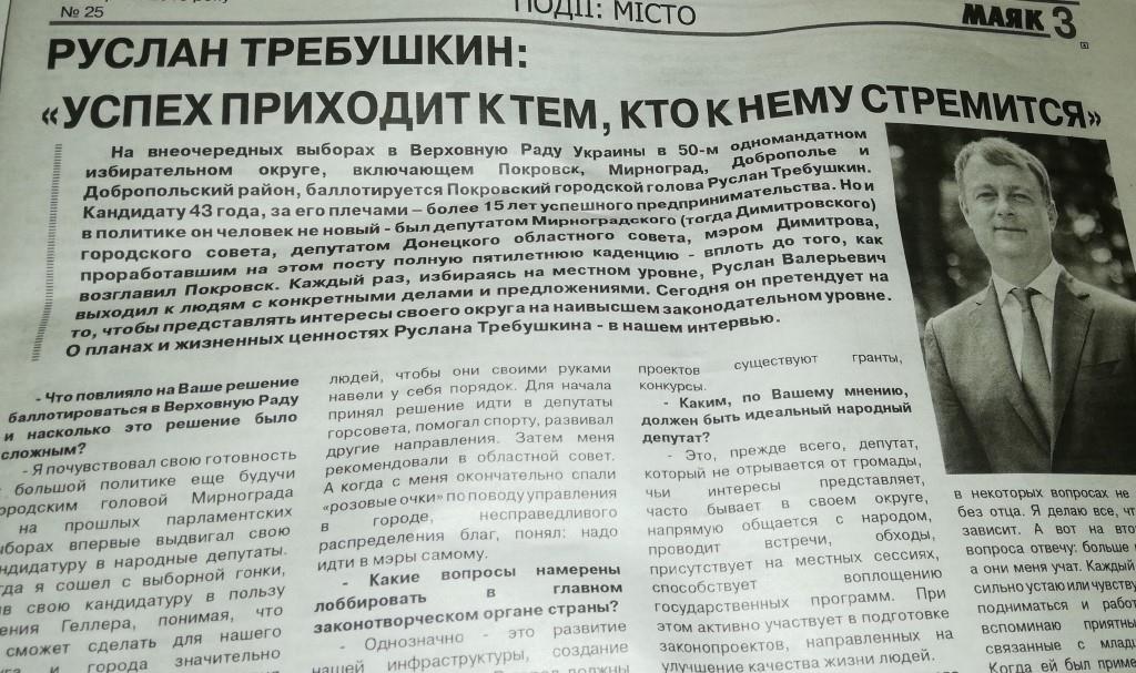 Три публікації про Руслана Требушкіна у покровському ЗМІ, де один - у контексті партії, ще два - велике інтерв’ю та передвиборча програма на останній сторінці. Усі матеріали розташовані у рамках одного випуску й не позначені як рекламні.