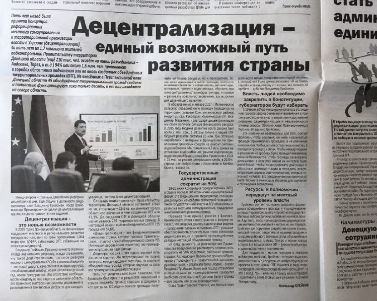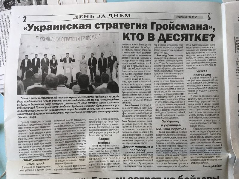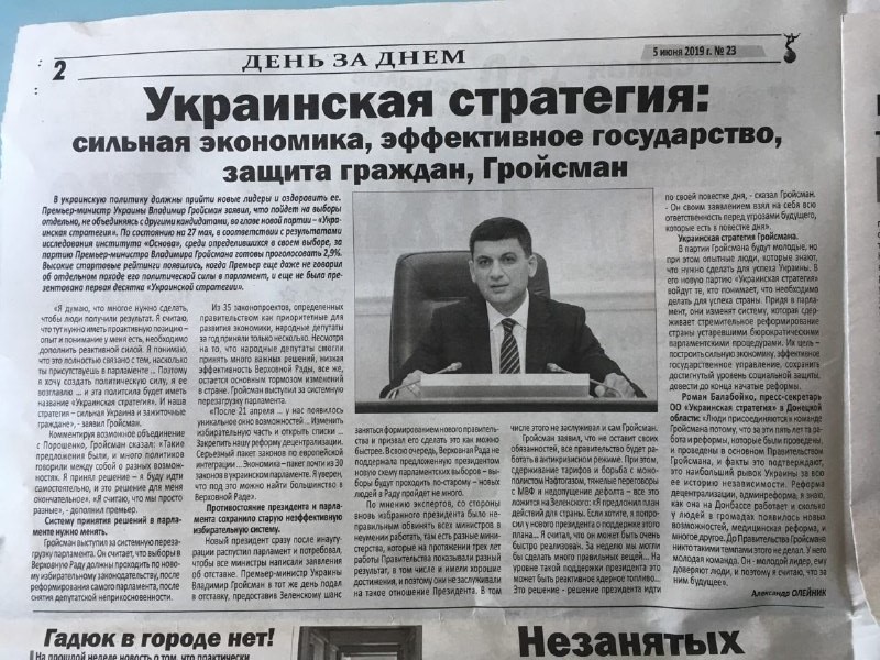 Політична партія «Українська стратегія Гройсмана» на чолі з чинним прем’єр-міністром Володимиром Гройсманом, який значиться у списку кандидатів у депутати, має три публікації з ознаками «джинси» у різних випусках однієї газети. Жодна публікація не позначена як рекламна й містить розгорнуті тези про діяльність партії, передвиборчу програму та підсумки з’їзду партії.