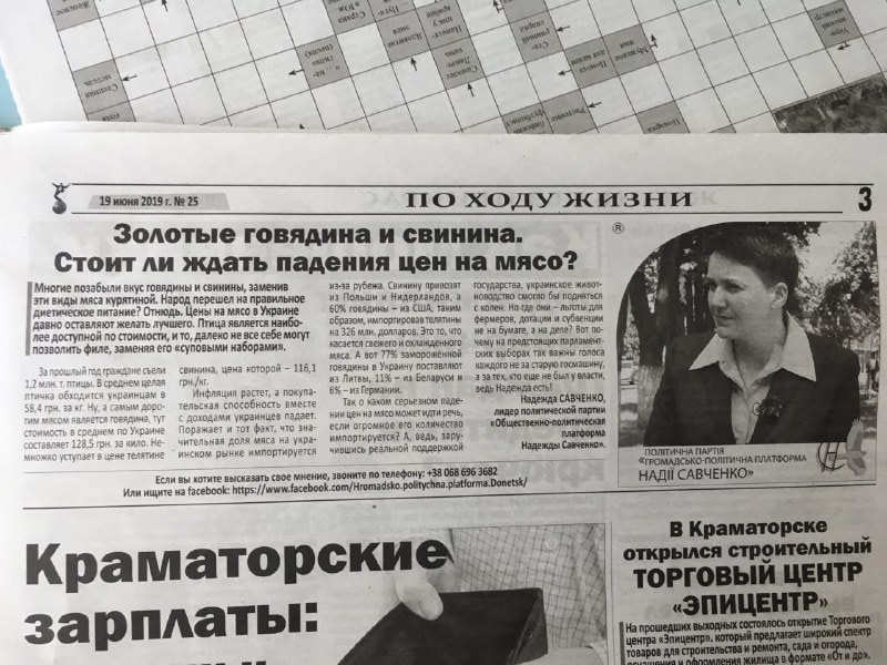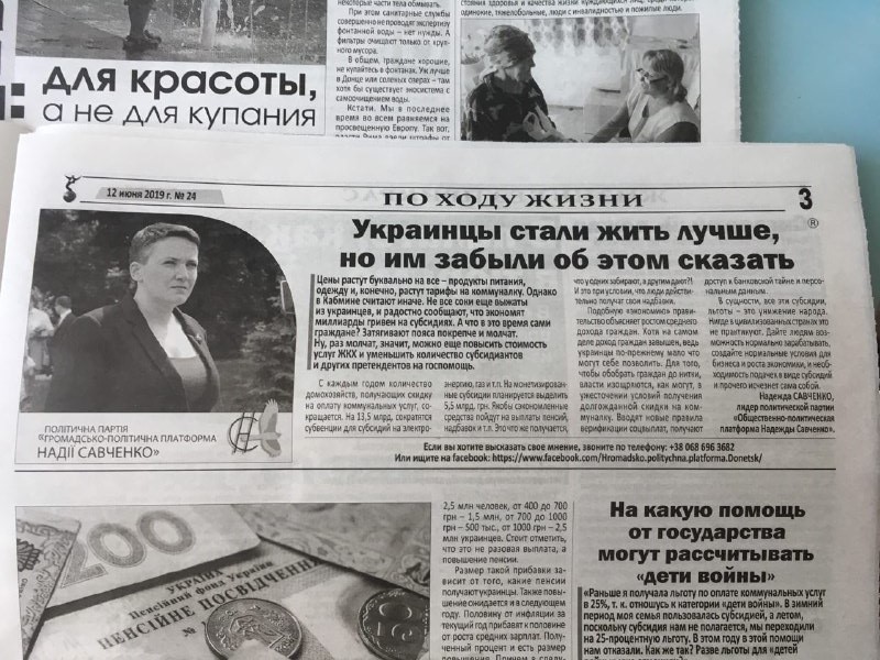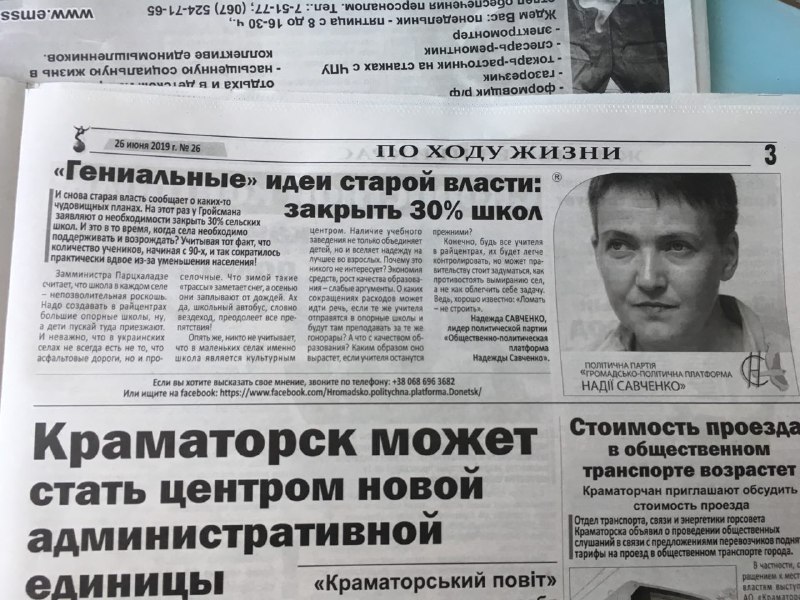 У трьох різних виданнях, тираж яких покриває значну частину підконтрольній Україні Донеччини, фігурують звернення лідерки «Громадсько-політичної платформи Надії Савченко», яка зареєстрована як кандидатка у депутати по 51 округу. Заяви кандидатки не відрізняються між собою риторикою, у зверненнях переважно йдеться про проблему трудової міграції в країні, цінову політику та загальний економічний стан. П’ять з семи публікації позначені як рекламні, решта дві опубліковані без маркування.