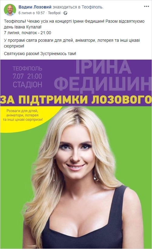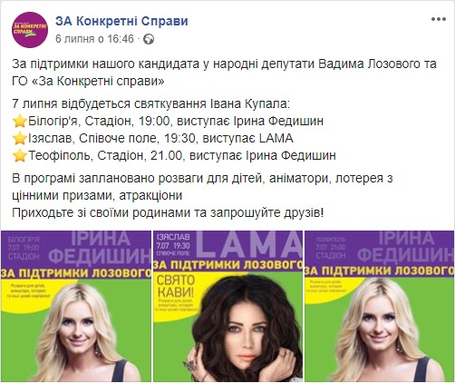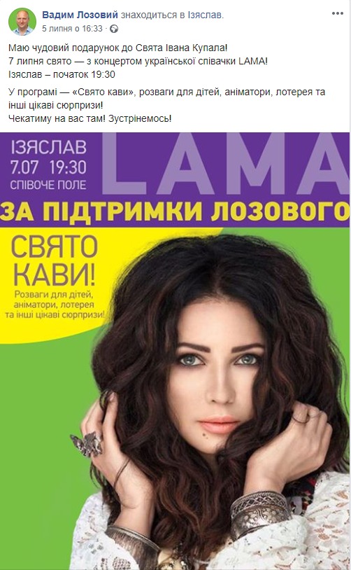 На Хмельниччині, у селищах Білогір’ї, Теофіполі та в місті Ізяславі, за підтримки кандидата в народні депутати у виборчому окрузі №192 Вадима Лозового та громадської організації «За конкретні справи» 7 липня відбулися гуляння з нагоди свята Івана Купала. Як анонсували на сторінках у Facebook самого кандидата й політичної партії «За конкретні справи», у програмі – виступи співачок Ірини Федишин та LAMA, а також «розваги для дітей, аніматори, лотерея з цінними призами, атракціони».