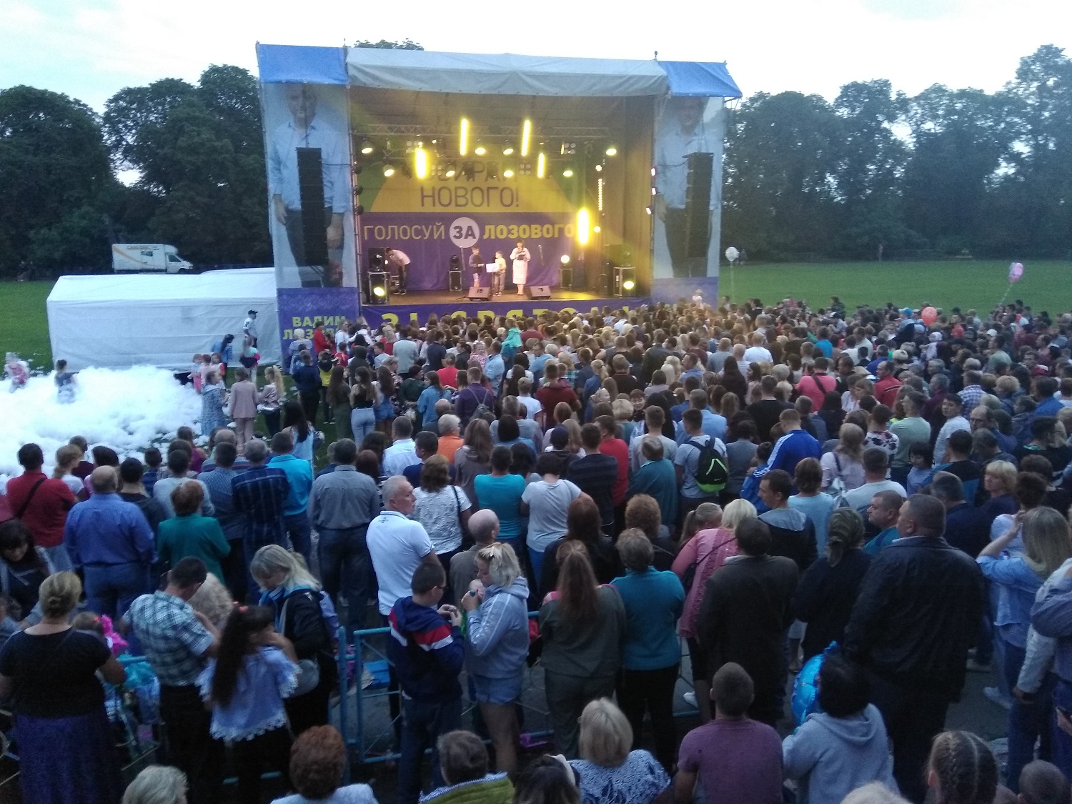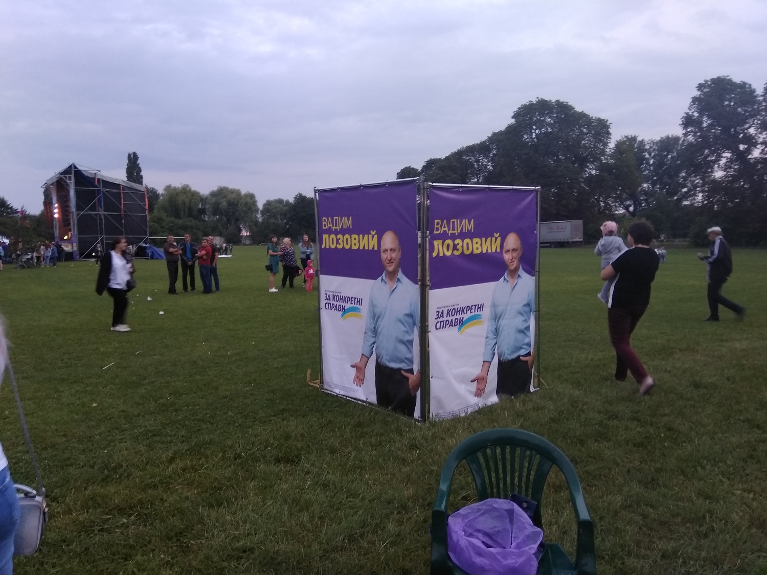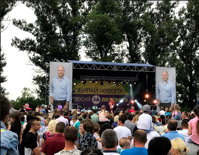 За словами спостерігачів ОПОРИ, сцена у всіх трьох населених пунктах була оформлена банерами кандидата, а на центральному банері було надруковано гасло Вадима Лозового «Обирай нового! Голосуй за Лозового». На території, де відбувались гуляння, ОПОРА також фіксувала агітаційну продукцію кандидата – банери із зображенням Вадима Лозового і написом «Політична партія «За конкретні справи». Водночас зі сцени неодноразово повідомляли, що організатором свята є громадська організація «За конкретні справи».