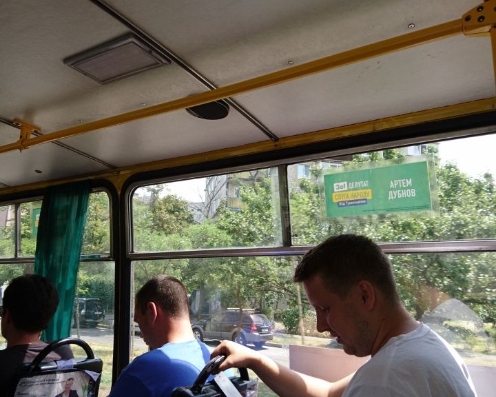 Кандидат балотується на Троєщині. Політичну агітацію вкотре зафіксовано на транспорті, що курсує по Деснянському районі.