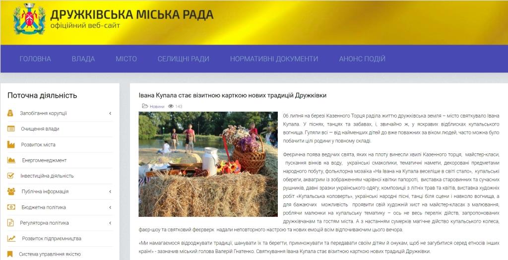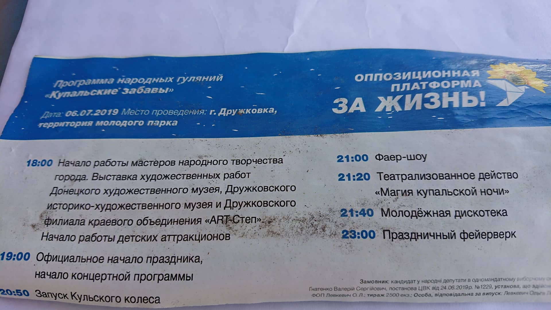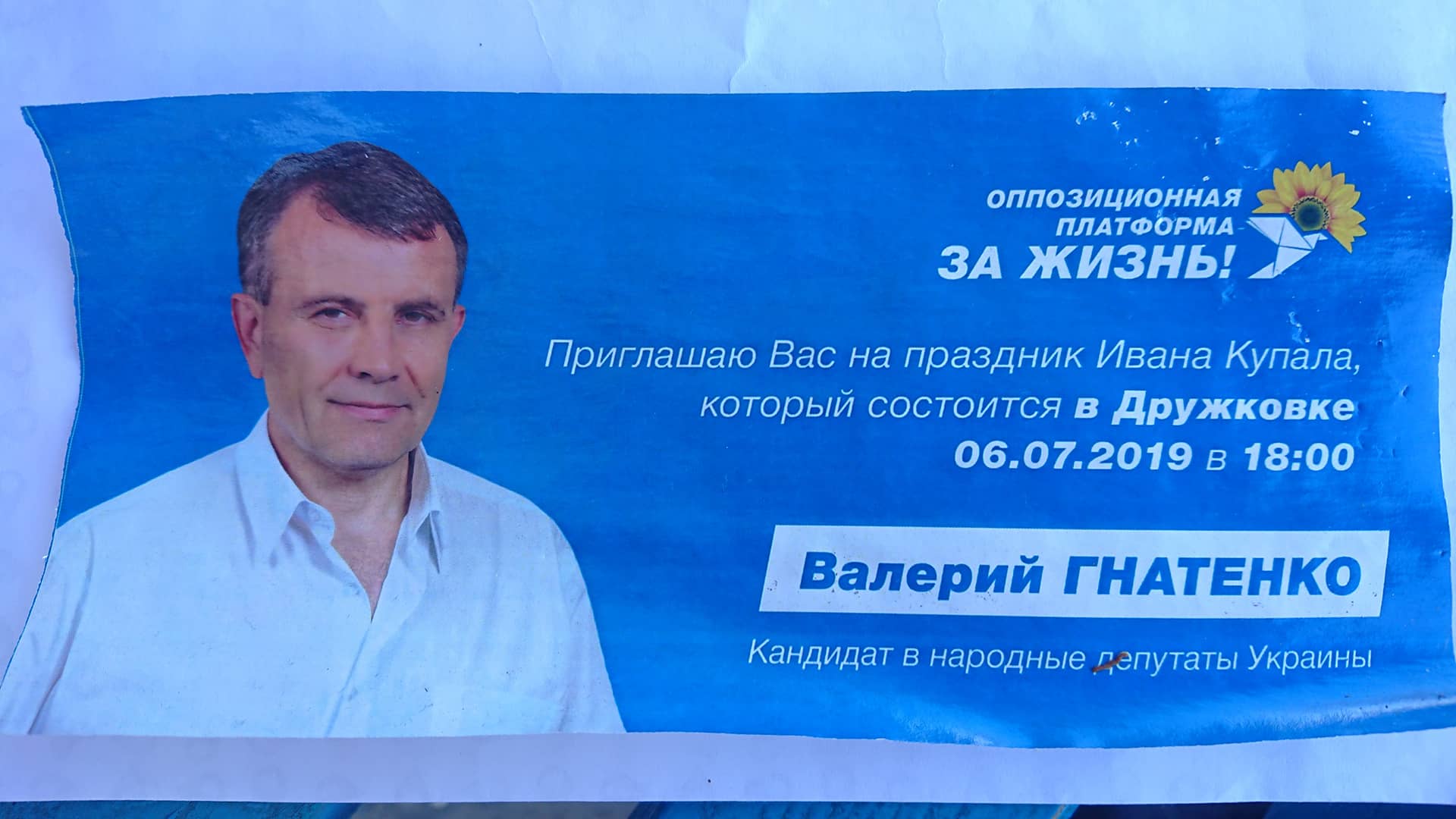 Нещодавно у Дружківці відбулося святкування Івана Купала при участі міського голови Валерія Гнатенка, який одночасно є кандидатом у виборчому окрузі №49. Саме святкування та участь у ньому міського голови висвітлено на сайті міської ради, а для запрошення гостей на захід надрукувано 2500 листівок із зображенням кандидата Валерія Гнатенка та з логотипом партії Опозиційна платформа – «За життя!».