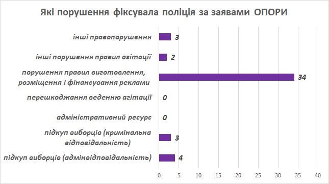 Всього спостерігачі ОПОРИ подали до поліції 46 заяв про можливі правопорушення. 34 з них стосувалися виготовлення і розміщення зовнішньої реклами без вихідних даних та, ймовірно, виготовленої не за рахунок виборчих фондів кандидатів і партій. На другому місці за частотністю виявилися заяви щодо можливого підкупу виборців шляхом надання безоплатних товарів та послуг.