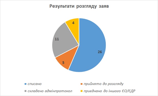 За результатами розгляду заяв поліція склала 12 адміністративних протоколів, причому 11 з них – за ст. 212-13 КУпАП (виготовлення або розповсюдження друкованих матеріалів передвиборної агітації, які не містять відомостей про установу, що здійснила друк, їх тираж, інформацію про осіб, відповідальних за випуск), один – за ст. 212-10 КУпАП (порушення обмежень щодо ведення передвиборної агітації).