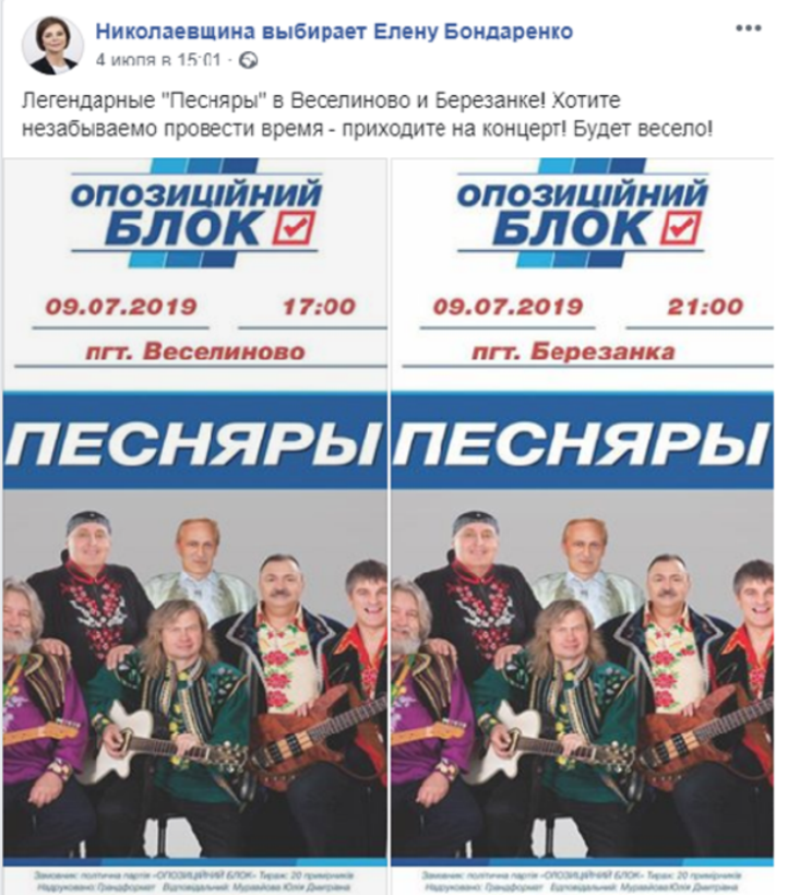 Так, 9  липня в окрузі № 131 пройшли аж два концерти ВІА «ПЕСНЯРЫ»  − у смт Веселинове та смт Березанка. Спершу, о 17:00 білоруський колектив виступив у Веселиновому. Організатором концерту була кандидатка в народні депутати від політичної партії «Опозиційний блок» по 131-му округу Олена Бондаренко.