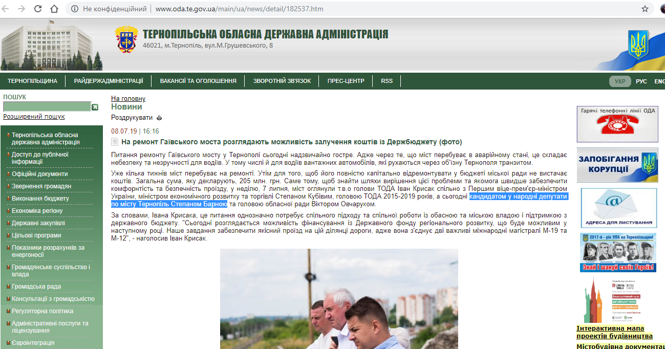 Із відеозапису, який спостерігач ОПОРИ встиг зробити на свій мобільний пристрій, до того як кондуктор заборонила зйомку, видно ті ж кадри, що і у сюжеті телеканалу Тернопіль1. Цей матеріал поширювався у соціальній мережі Facebook із назвою «Степан Барна: Тернопіль має стати логістичним центром Західної України» та висвітлював проблему із фінансовим забезпеченням ремонту Гаївського мосту. Сюжет містив коментар кандидата Степана Барни, у якому він обіцяє, обійнявши посаду народного депутата, домогтися виділення коштів на ремонт мосту та реалізувати цей проект.