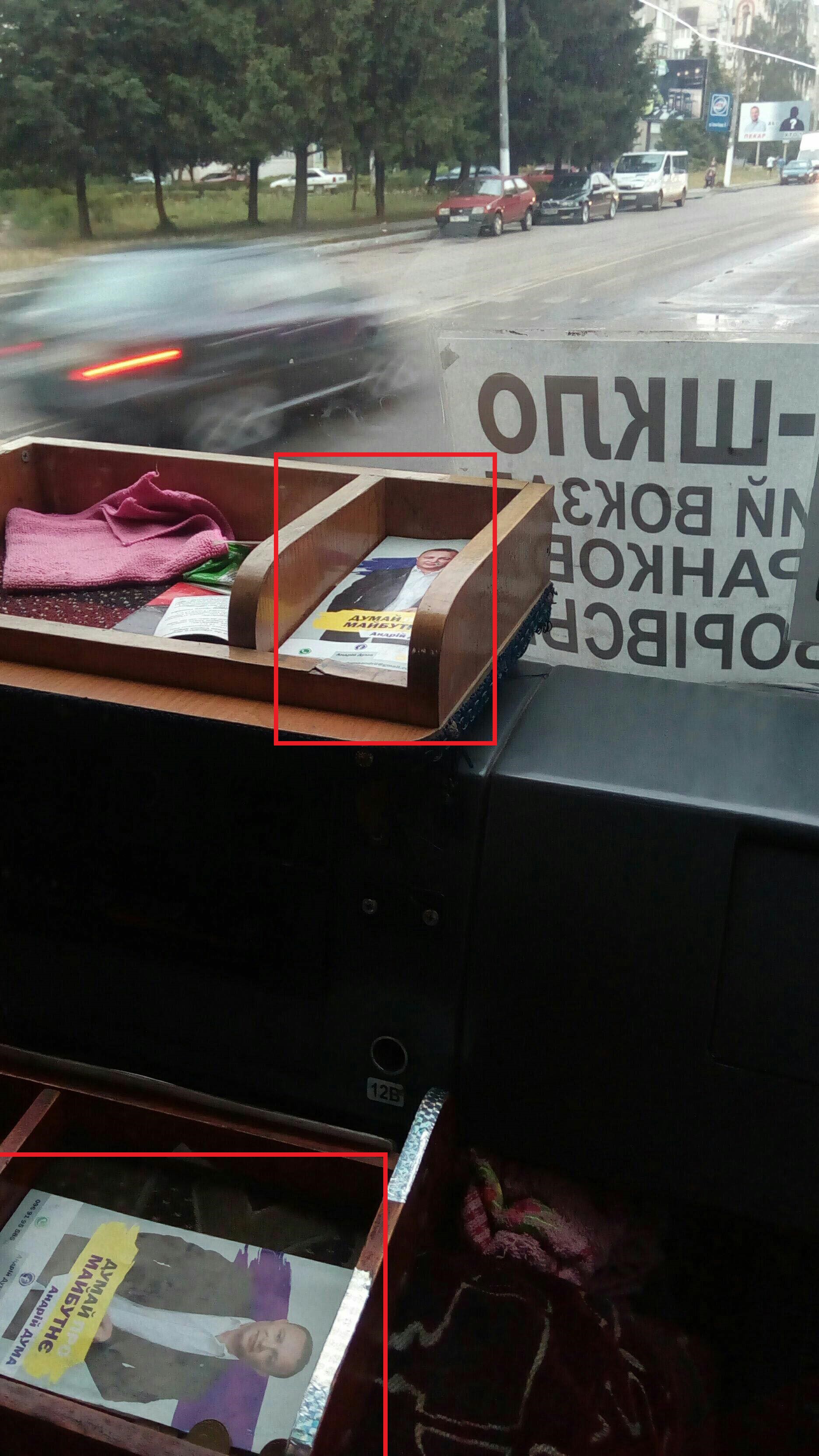 Буклети «Думай про майбутнє» Андрія Думи спостерігачі ОПОРИ зафіксувала 8 липня у приміському автобусі №125. Дума є кандидатом у народні депутати у виборчому окрузі №122 від політичної партії «Громадянська позиція».