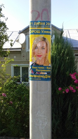 На телефонній будці, зупинці громадського транспорту, електроопорах (118 округ) розклеєні плакати із зображенням кандидатки від «Громадянської позиції» Уляни Дорош. На постерах текст «Ваш голос – Ваш вибір! Підтримайте зміни! #УпевненоДію». Уляна Дорош зазначила: «Людям, агітаторам, з якими я працюю, яким я давала такі матеріали, а вони розносили, я говорила, що вони мають бути розміщені лише на дошках оголошень. Веду розмову, не можу пояснити, чому розвішують так. Всіх не можу впильнувати, штат великий. Згідно закону орган місцевого самоврядування має надати нам відповідні місця для агітації. По селах, як таких в нас нема. В селах з деякими головами сільських рад говорила, то вони дозволяли і в інших місцях. Вони кажуть, що потім їхня комунальна служба це все почистить. Вішайте, де вам зручно. Агітація, вибори, тільки не зривайте чужих кандидатів, будьте чесними».