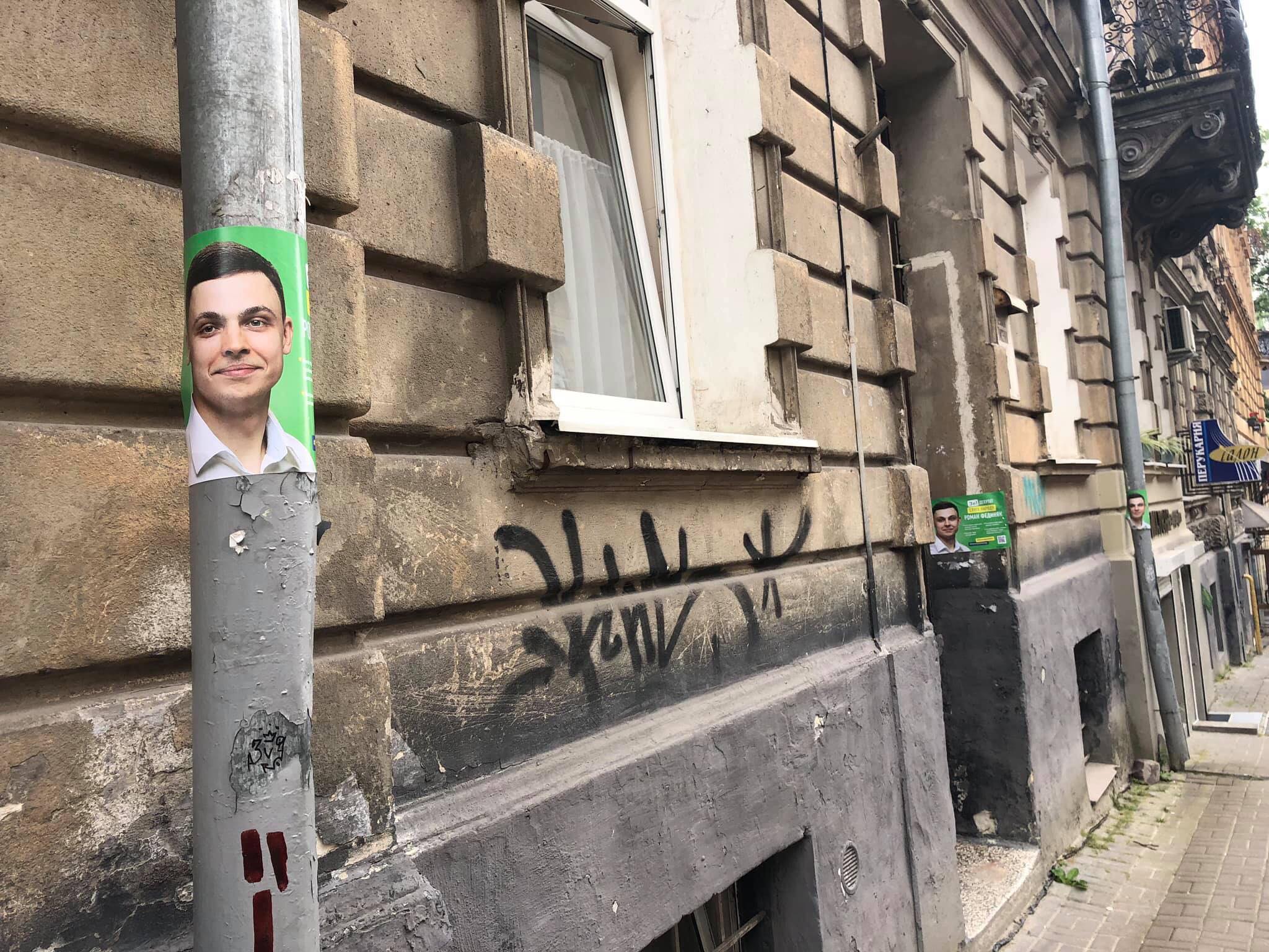 При вхідних дверях на фасадах будинків та електроопорах у виборчому окрузі №117 розклеєні плакати кандидата він «Слуги народу» Романа Фединяка. Агітаційні матеріали з текстом: «Зе!Депутат Слага народу!» «Дякую, що ви на це звернули увагу. Ми вже відреагували на ті всі моменти. Ми безпосередньо, я особисто, навіть наскільки мав можливість ходив і зривав ці плакати. Ми, на превеликий жаль, не можемо все проконтролювати, зважаючи на те, що є дуже обмежений термін. Ми знаємо про ці порушення з нашої сторони, ми це усунули. Що стосується під’їздів, зараз агітація розміщена виключно на дошках оголошень. Зі стовпів прибралося зразу, коли я отримав фотографії», - розповів Роман Фединяк.