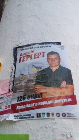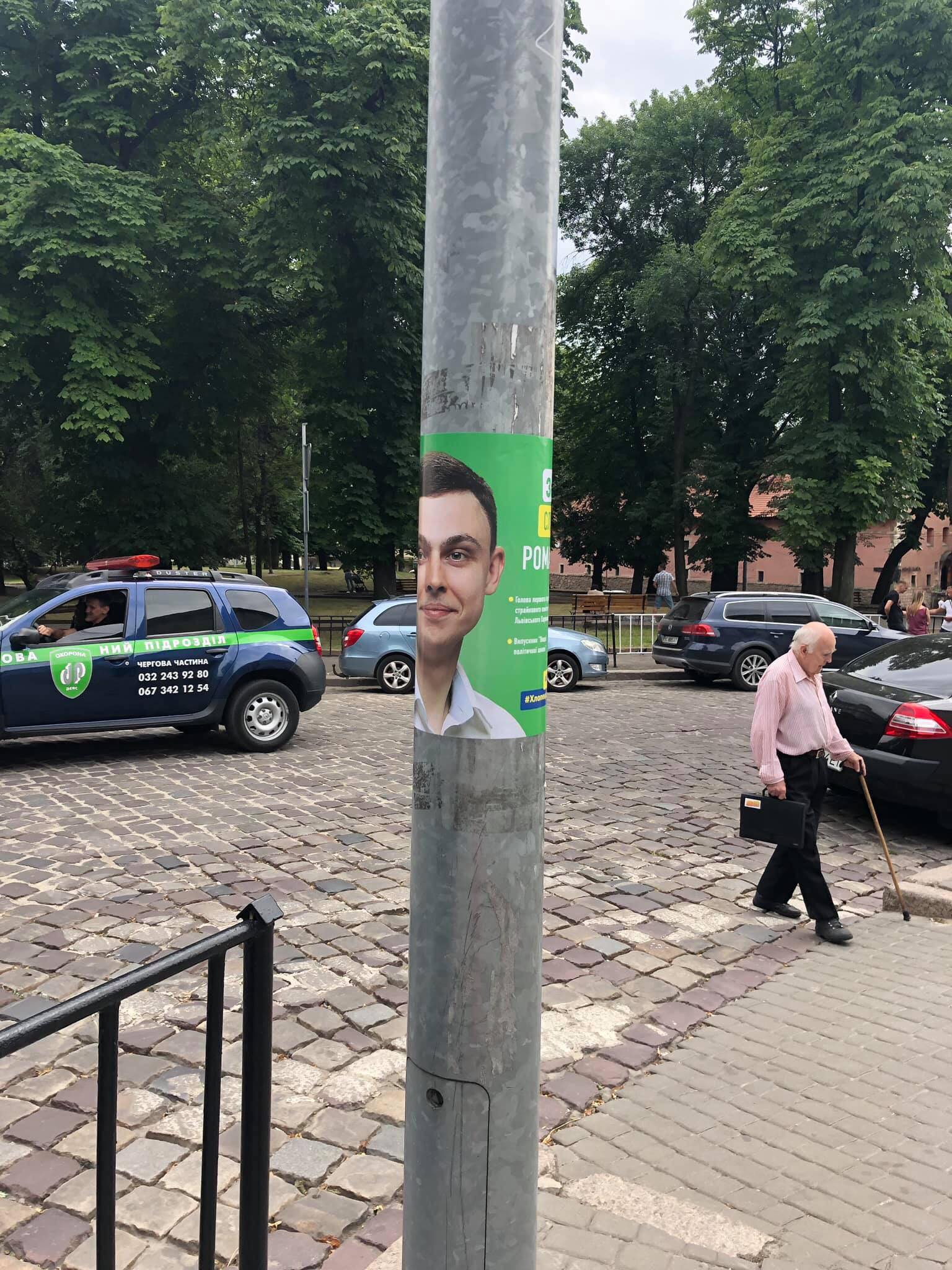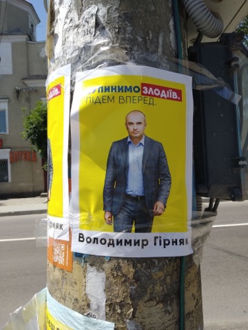 «Підемо вперед» постери Володимира Гірняка ОПОРА зафіксувала на стовпах у 120 окрузі. Матеріали - без вихідних даних. «Я не займаюся штабом, є люди, які займаються, є активісти. Я просив, щоб все було в межах чинного законодавства. Я думаю, воно так є. Я не готовий казав, хто там що наклеїв», - розповів Гірняк.