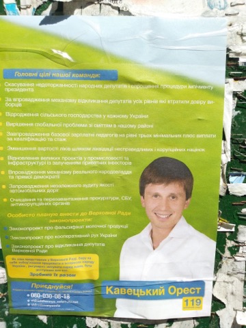 У 119 окрузі на електроопорах, парканах, балконах висять агітаційні матеріали кандидата від «Слуги народу» Ореста Кавецького. Не усі плакати Кавецького мають вихідні дані. А саме ті, на них кандидат подає інформацію щодо сільського кооперативу - створення прийомних пунктів по збору сезонної продукції, забезпечення членів організації саджанцями різних культур, залучення спеціалістів для контролю процесу вирощування рослин, збільшення робочих місць та покращення добробуту села. «Не дамо українському селу зникнути», - біблорди з таким закликом та зображенням Ореста Кравецького спостерігачі ОПОРИ фіксували ще з кінця травня.