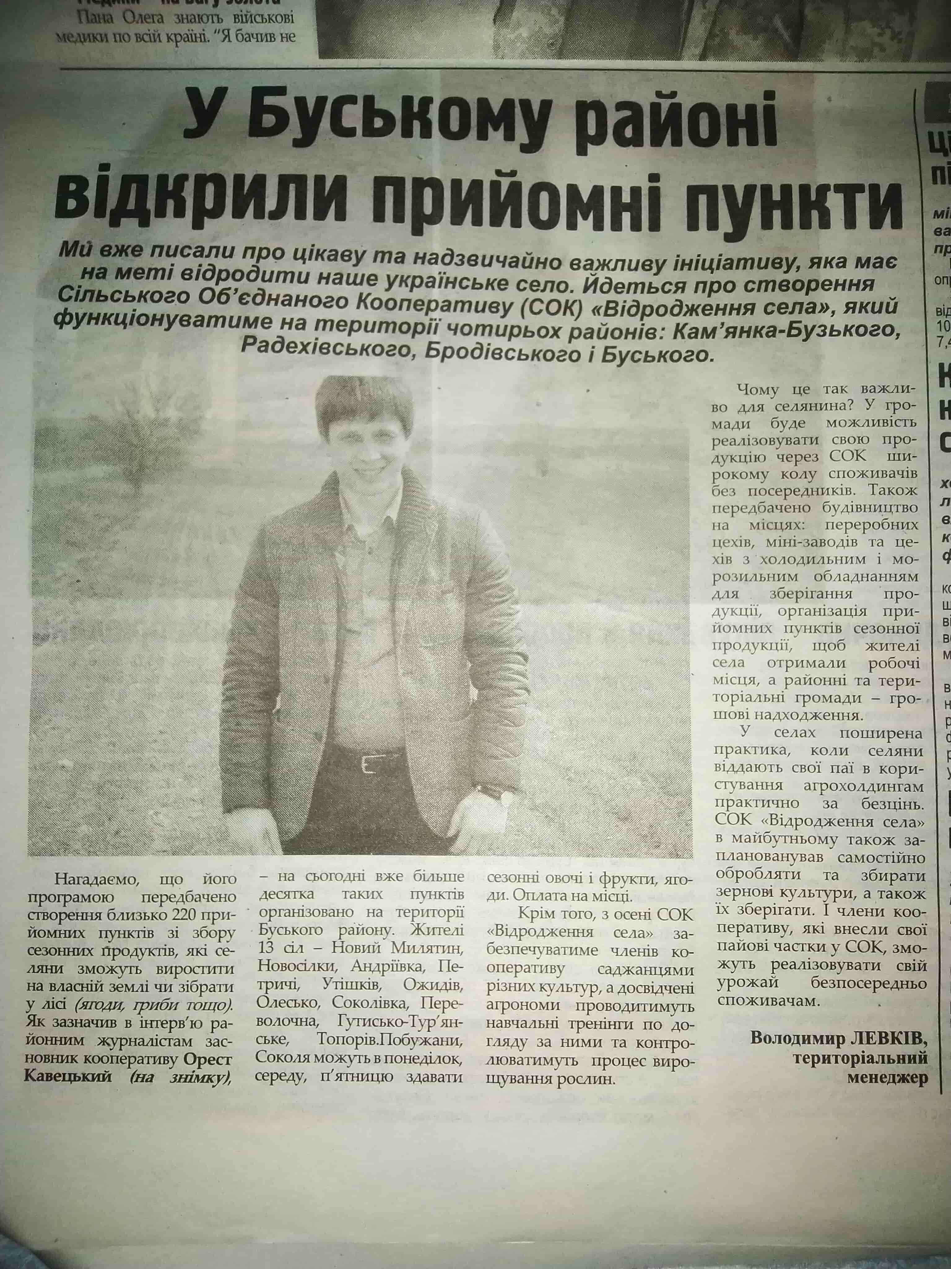 Публікацію про створення у Буському районі прийомних пунктів опублікували в газеті «Воля народу» (за 20 червня). ОПОРА під виглядом потенційних клієнтів зателефонувала у кооператив, щоб поцікавитися про його роботу. По той бік слухавки чоловік розповів, що зараз збирають чорницю, малину, вишні, аґрус. Саджанці для членів кооперативу обіцяють роздавати восени. На уточнююче запитання, як вступити в кооператив, відповіли: «Заповнюєте заявку. І сплачуєте два членські внески по 300 гривень. Можливо, сам кооператив сплатить», - розповіли в організації.