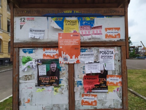 Спостерігачі Громадянської мережі ОПОРА зафіксували 4 випадки розміщення агітаційних матеріалів про кандидатів у громадському транспорті. Також політичні партії та кандидати розміщують рекламні плакати, запрошення на зустрічі з виборцями на електроопорах, закинутих будівлях, парканах, церковних дошках. Часто ці матеріали є без вихідних даних.