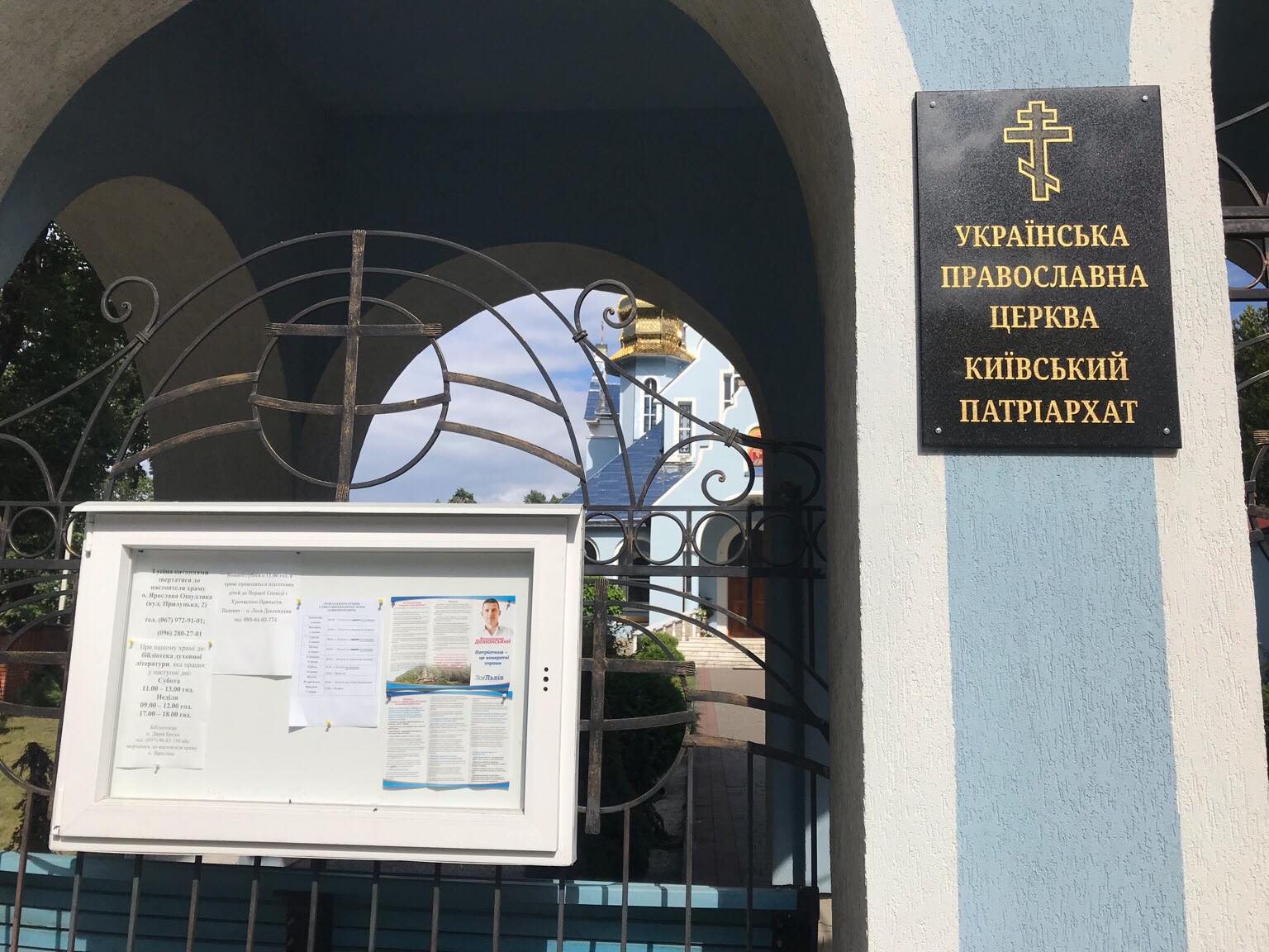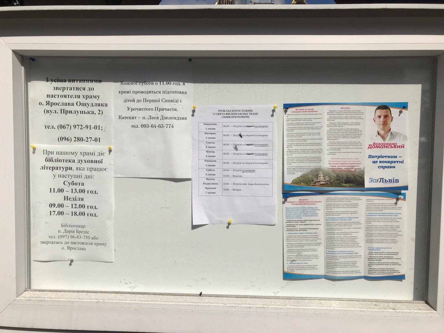 Агітаційні буклети селищного голови Брюхович спостерігачі ОПОРИ зафіксували на церковній дошці оголошень (виборчий округ №122). «Це повісила громада. Я скажу, щоб це зняли. Він не бачив того. Оце так роздавали, хтось взяв і повішав. Я що маю щось проти цього. Тим більше він зробив багато для нашого селища», - розповів настоятель храму отець Ярослав Ощудляк.
