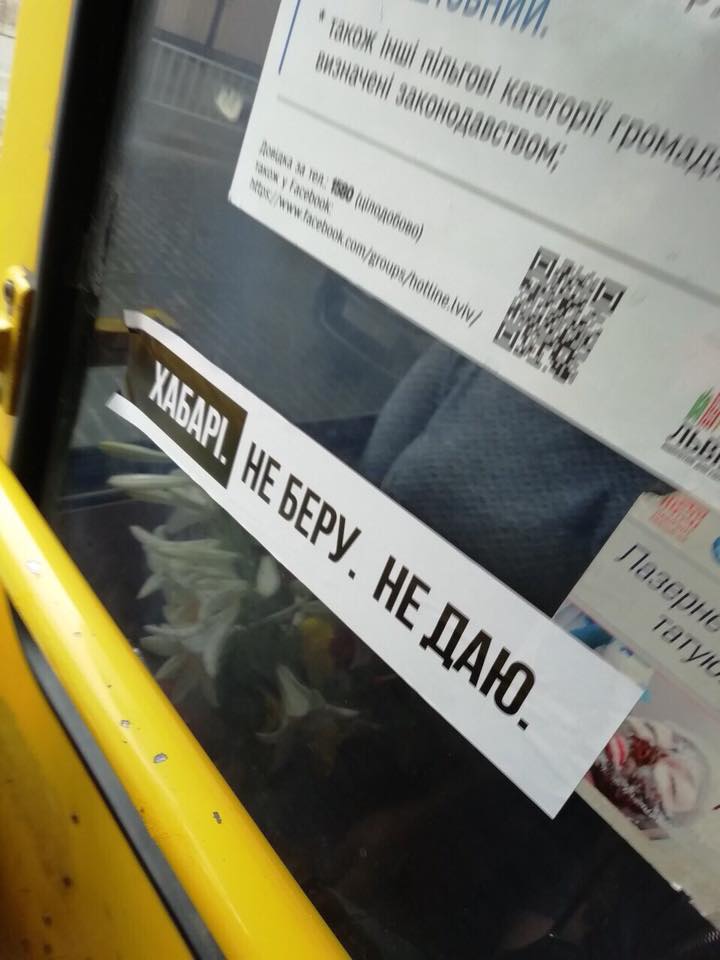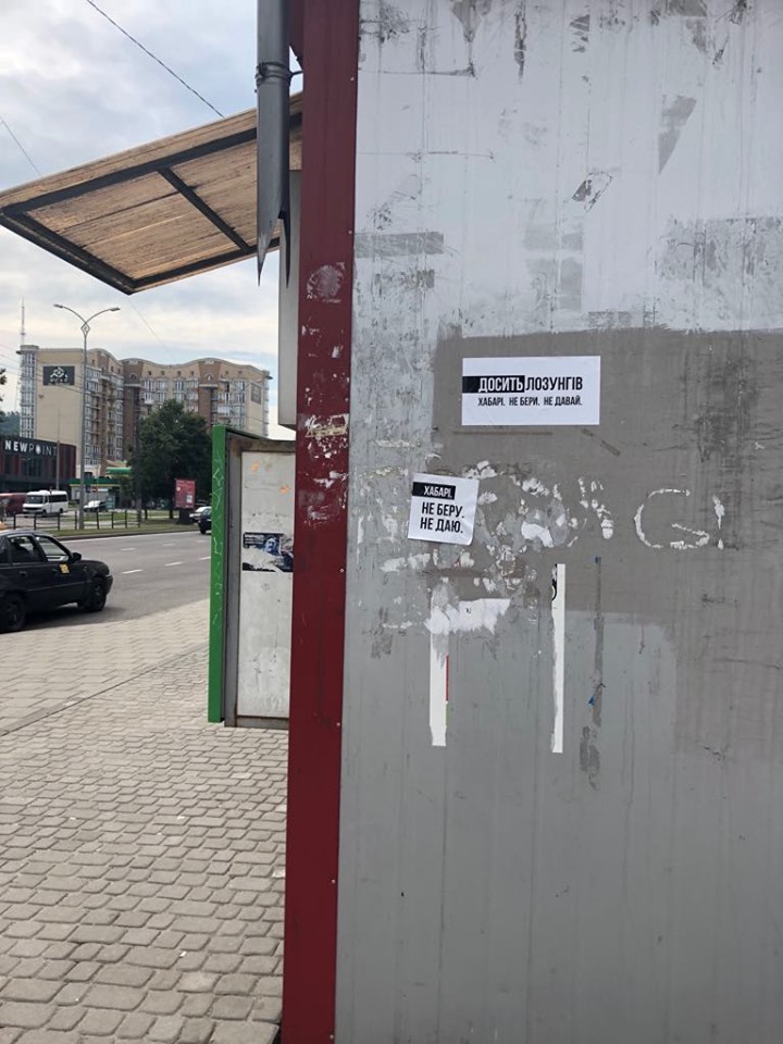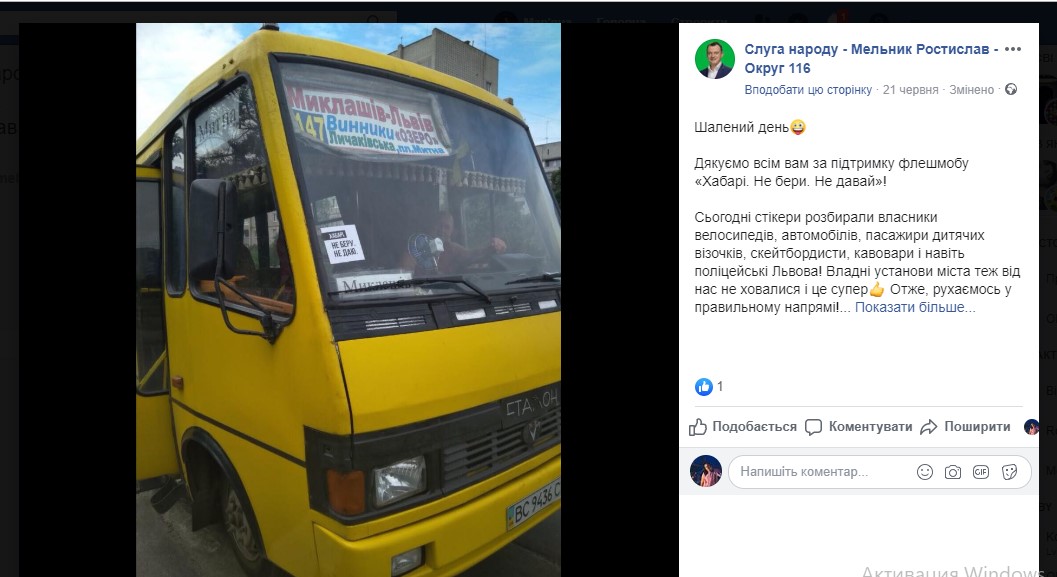 Також наліпки з гаслом «Хабарі. Не беру. Не даю» ОПОРА зафіксували у приміському автобусі №184 7 липня. Цей лозунг використовує на сторінці у соцмережі Ростислав Мельник. Дві світлини, на яких на громадському транспорті є аналогічні наліпки, Мельник опублікував у своєму пабліку 21 червня.