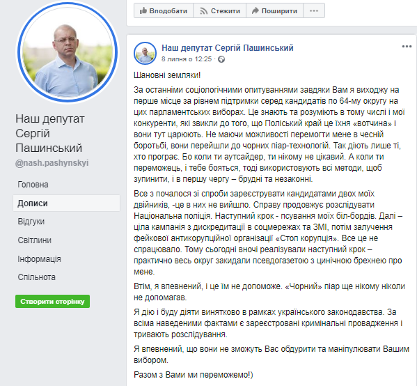 «Все почалося зі спроби зареєструвати кандидатами двох моїх двійників, -це в них не вийшло. Справу продовжує розслідувати Національна поліція. Наступний крок - псування моїх біл-бордів. Далі – ціла кампанія з дискредитації в соцмережах та ЗМІ, потім залучення фейкової антикорупційної організації «Стоп корупція». Все це не спрацювало. Тому сьогодні вночі реалізували наступний крок – практично весь округ закидали псевдогазетою з цинічною брехнею про мене. Втім, я впевнений, і це їм не допоможе. «Чорний» піар ще нікому ніколи не допомагав», – йдеться у дописі.