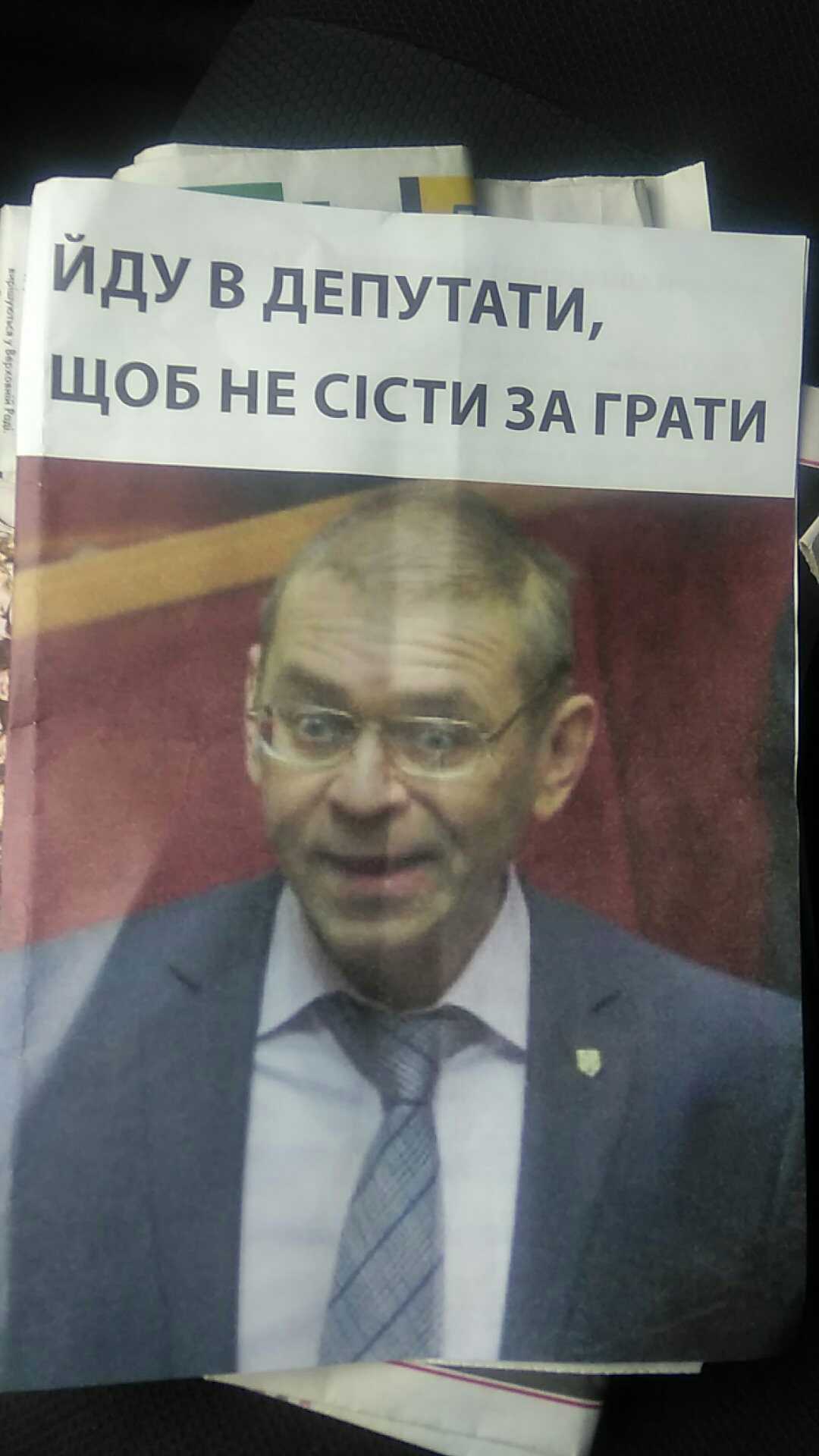 На першій сторінці листівки – фото Сергія Пашинського і напис: «Йду в депутати, щоб не сісти за грати». На 2, 3 та 4 сторінках матеріал під назвою: «Наші діти гідні жити без таких, як Пашинський».