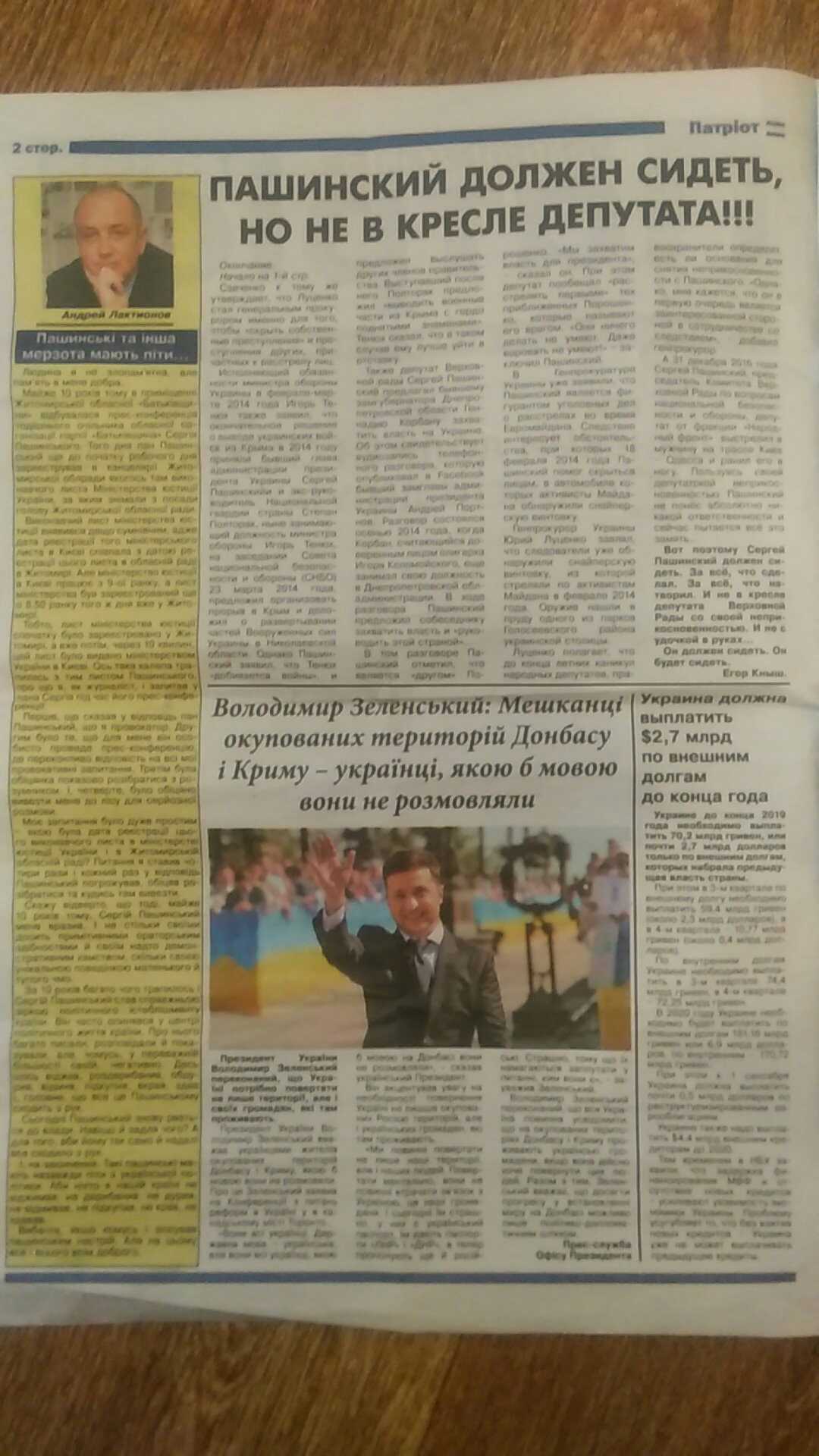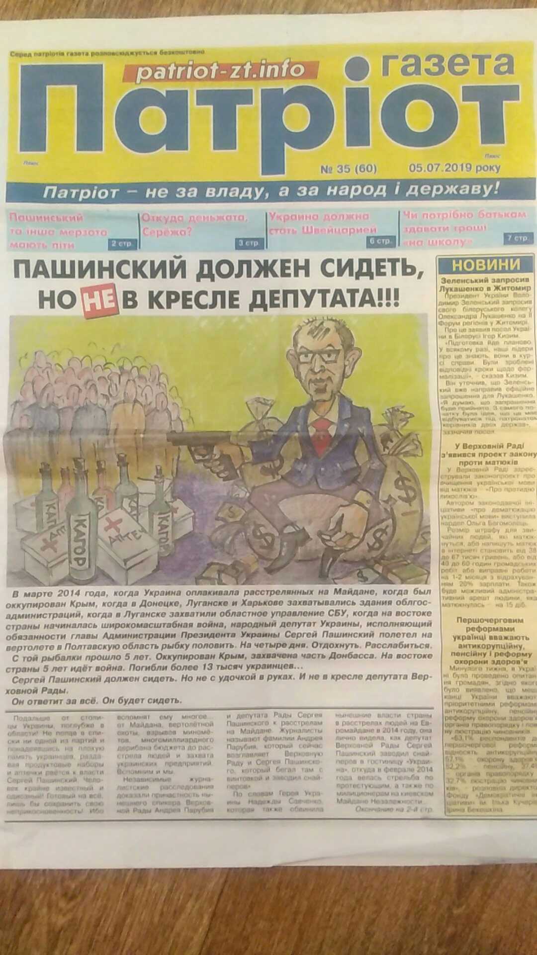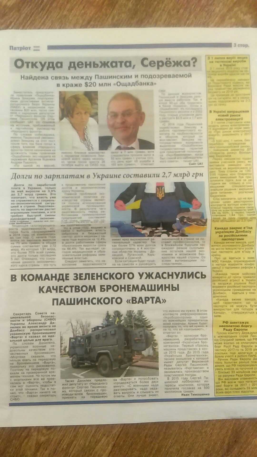 На 1 та 2 сторінках газети розміщений матеріал під назвою «Пашинский должен сидеть, но не в кресле депутата». Кандидату присвячена новина і на 3 сторінці під заголовком: «Откуда деньжата, Сережа? Найдена связь между Пашинским і подозреваемой в краже $20 млн «Ощадбанка».