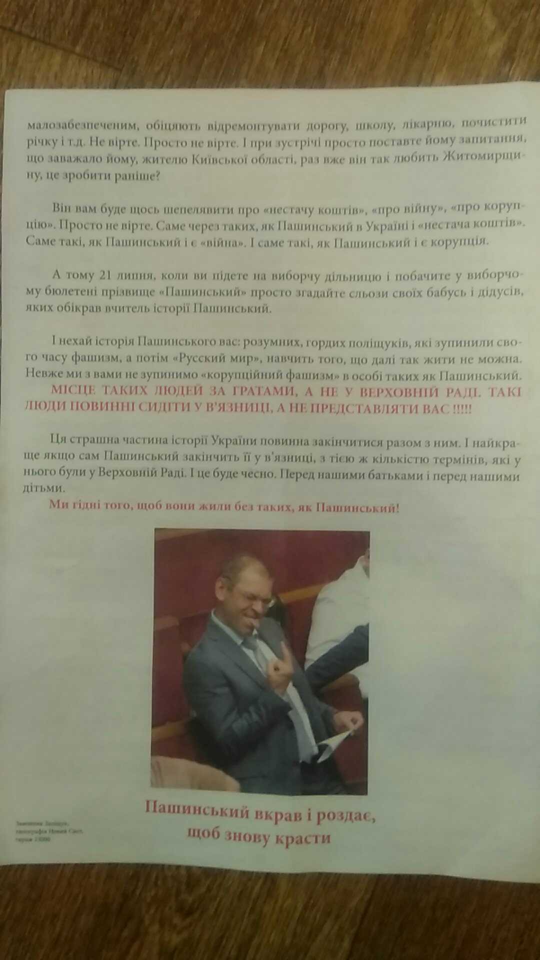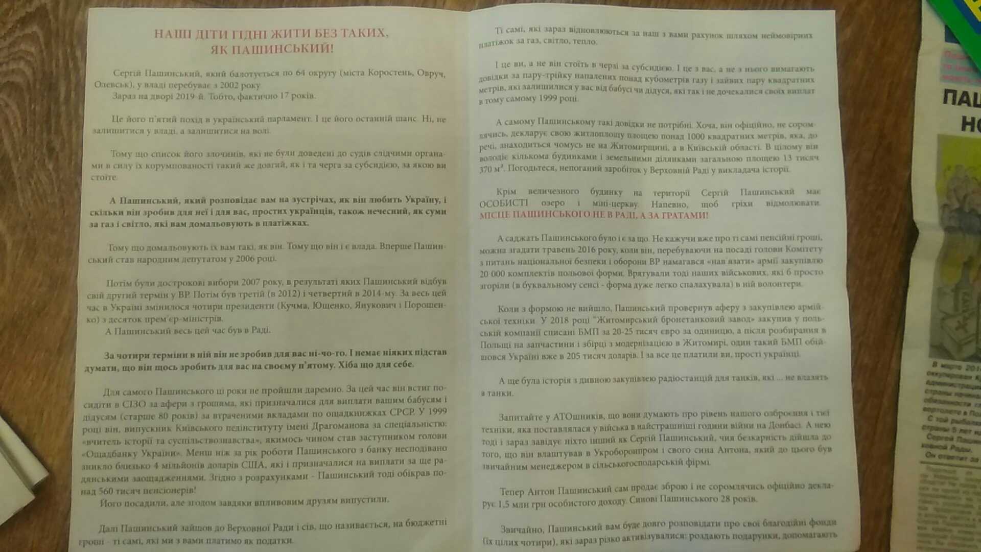У одномандатному виборчому окрузі №64 (м. Коростень), по вулицях та поштових скриньках населених пунктів розповсюджували листівки та газети з ознаками «чорного піару» проти кандидата в народні депутати Сергія Пашинського, який є народним депутатом України та балотується шляхом самовисування від ВО №64.