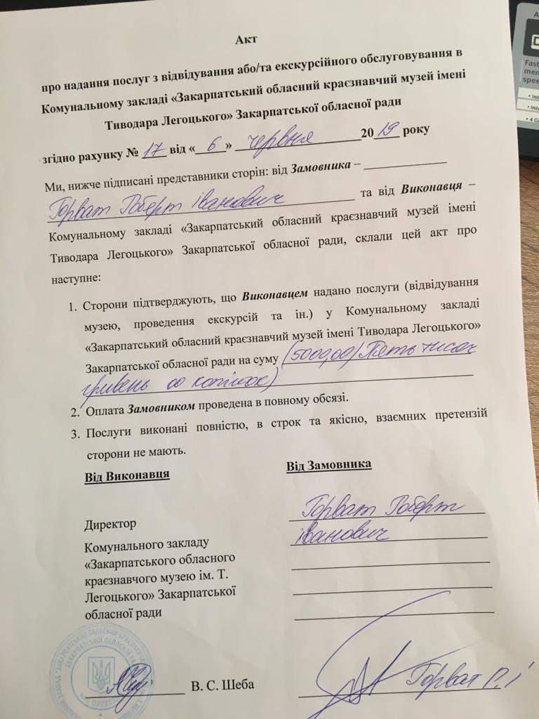 Спостерігачка  ОПОРИ надіслала до Закарпатської обласної ради запит на доступ до публічної інформацію із питанням про оплату заходу. Запит переадресували безпосередньо до комунальної установи «Закарпатський обласний краєзнавчий музей імені Тиводора Легоцького». Там у відповідь надали договір, згідно з яким  вартість обслуговування заходу коштувала 5000 гривень, а замовником вказаний Роберт Іванович Горват як фізична особа. Договір датований 6 червня, оплата пройшла, згідно з документами, 21 червня..