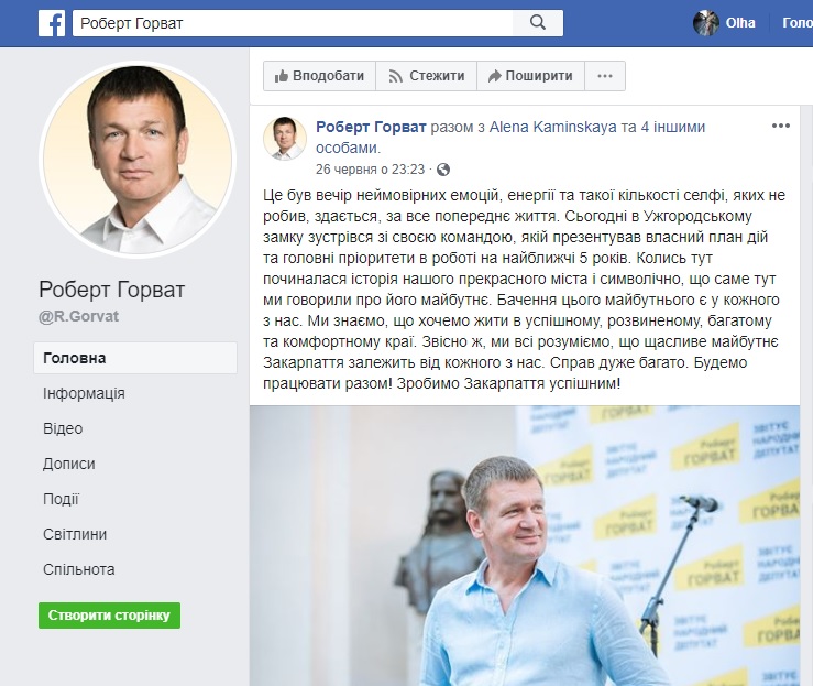 Захід пройшов 26 червня, у ЗМІ подію називали зустріччю депутата із чисельними прихильниками та волонтерами. «Це був вечір неймовірних емоцій, енергії та такої кількості селфі, яких не робив, здається, за все попереднє життя. Сьогодні в Ужгородському замку зустрівся зі своєю командою, якій презентував власний план дій та головні пріоритети в роботі на найближчі 5 років. Колись тут починалася історія нашого прекрасного міста і символічно, що саме тут ми говорили про його майбутнє. Бачення цього майбутнього є у кожного з нас. Ми знаємо, що хочемо жити в успішному, розвиненому, багатому та комфортному краї. Звісно ж, ми всі розуміємо, що щасливе майбутнє Закарпаття залежить від кожного з нас. Справ дуже багато. Будемо працювати разом! Зробимо Закарпаття успішним!», - йдеться на сторінці Роберта Горвата у Фейсбуку.