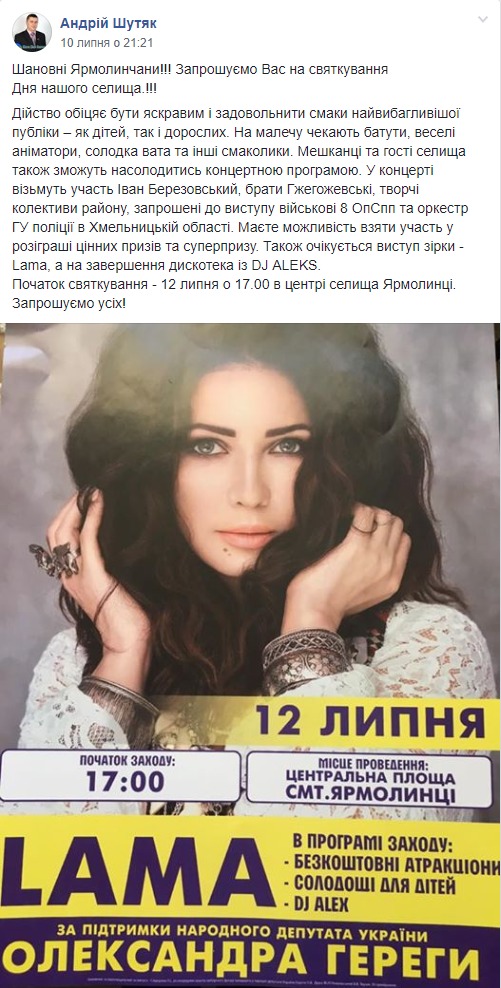 В афішах, які поширювали перед концертом, зазначалося, що виступ співачки LAMA відбудеться за підтримки народного депутата України Олександра Гереги. Допис із фото афіші, зокрема, розмістив у групі «Ярмолинці, які вони є?!» в мережі Facebook голова Ярмолинецької райдержадміністрації Андрій Шутяк. У пості посадовець запрошував мешканців селища відвідати святкування.