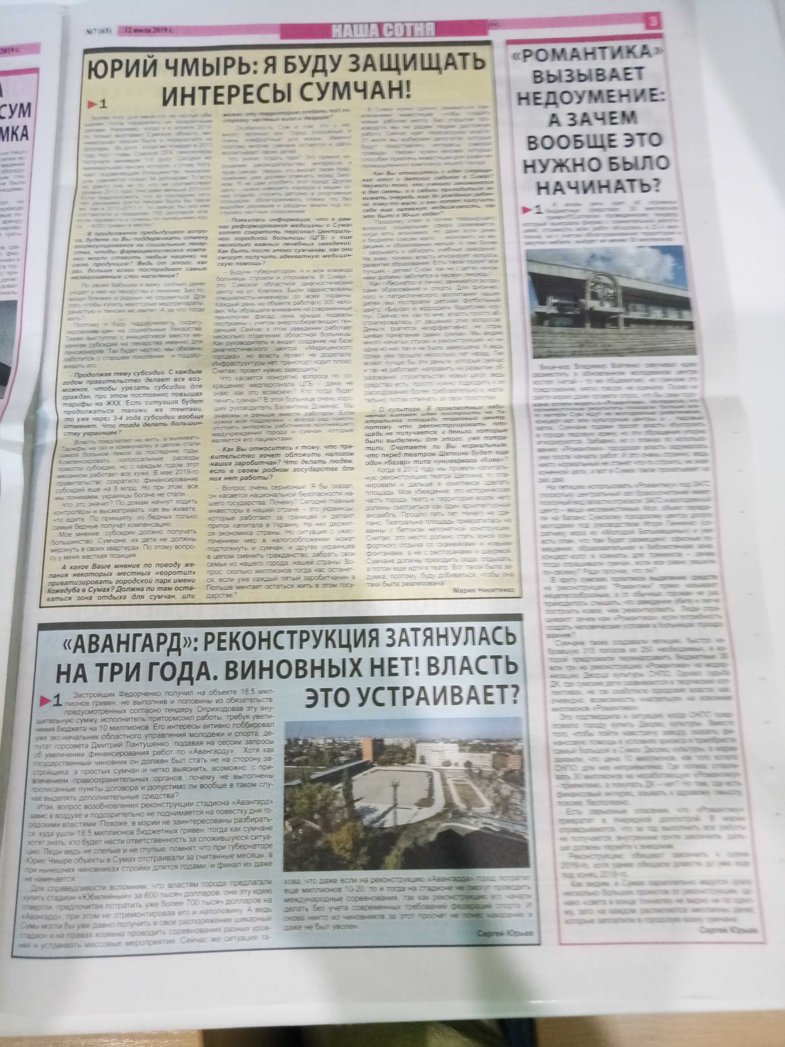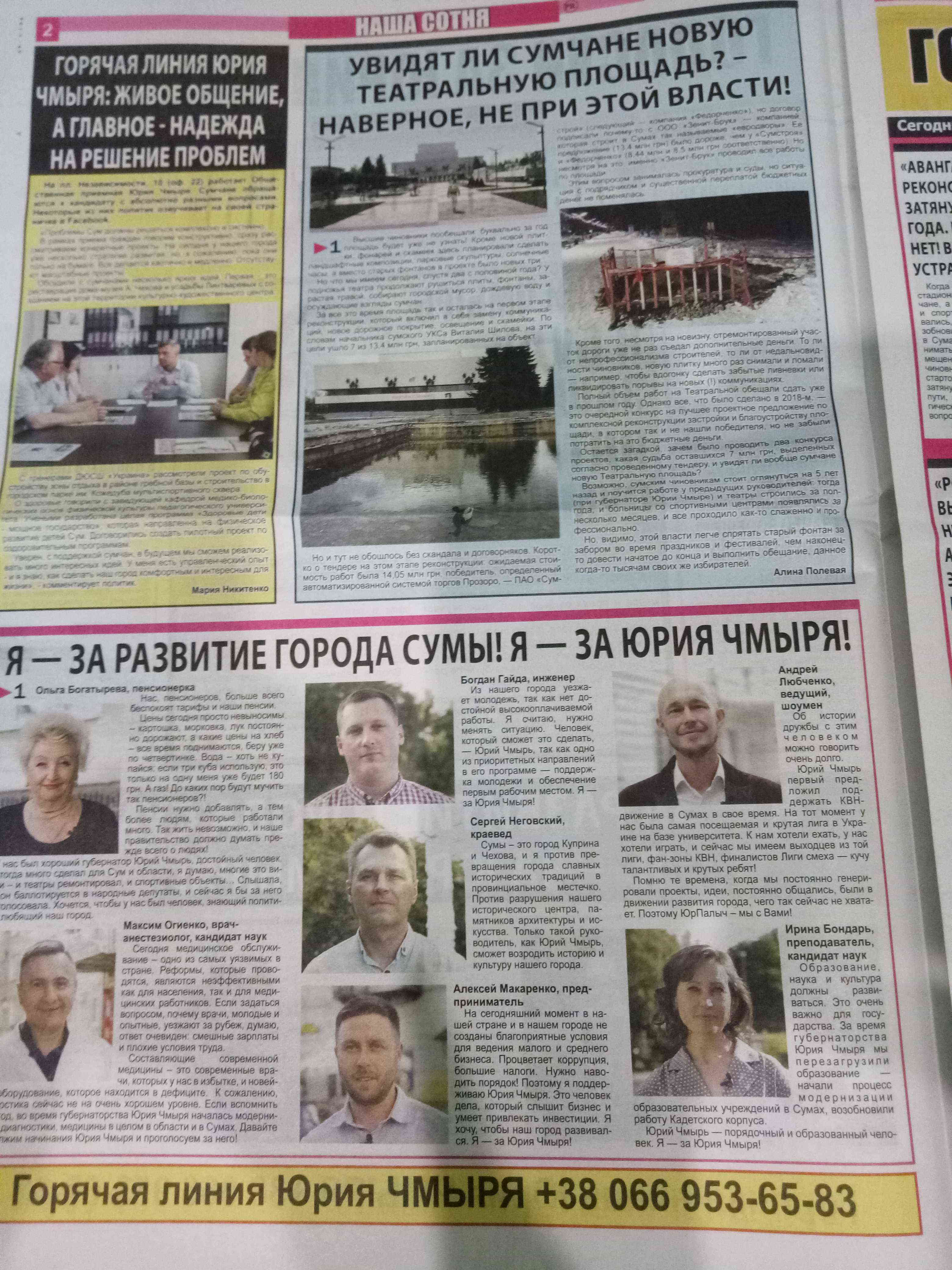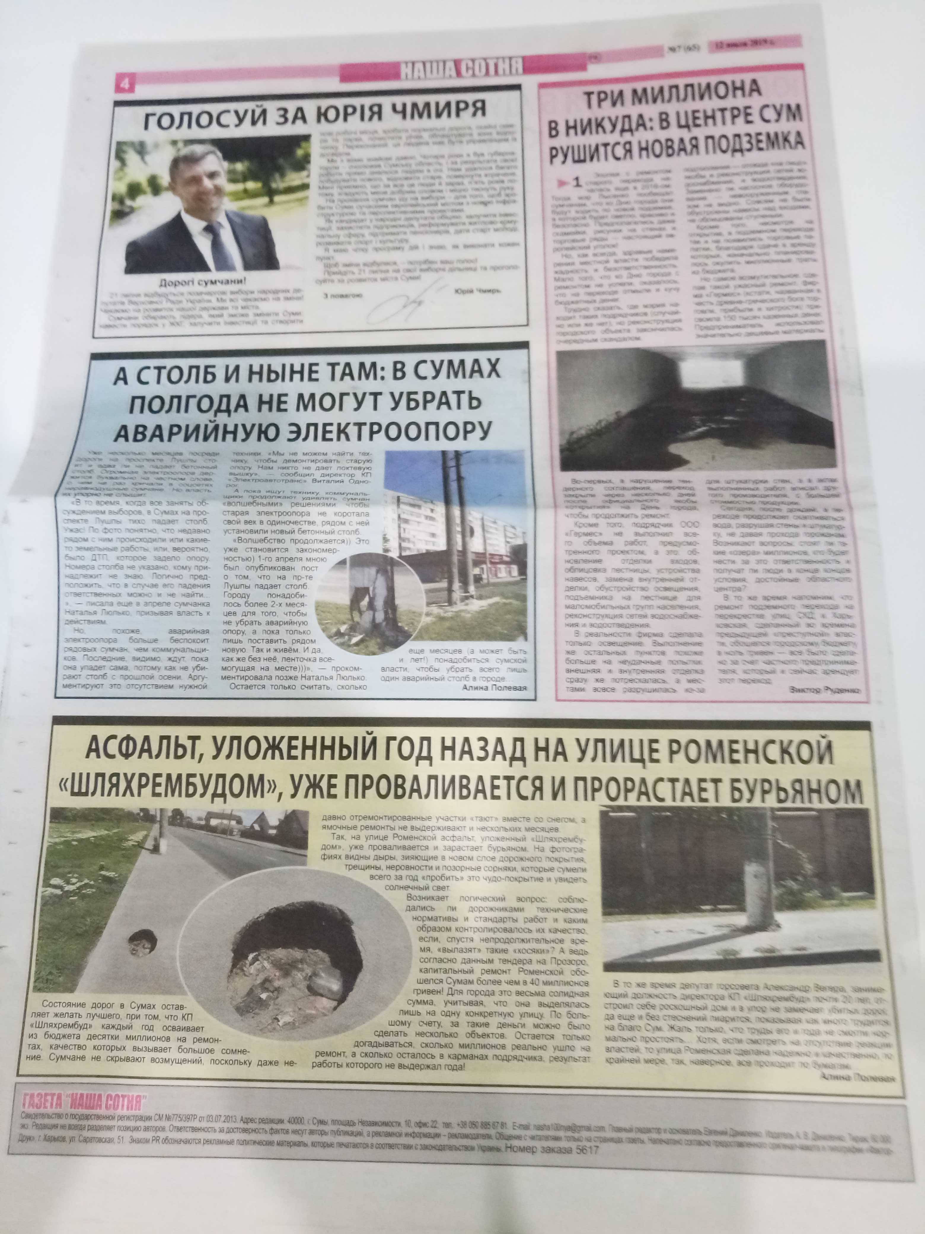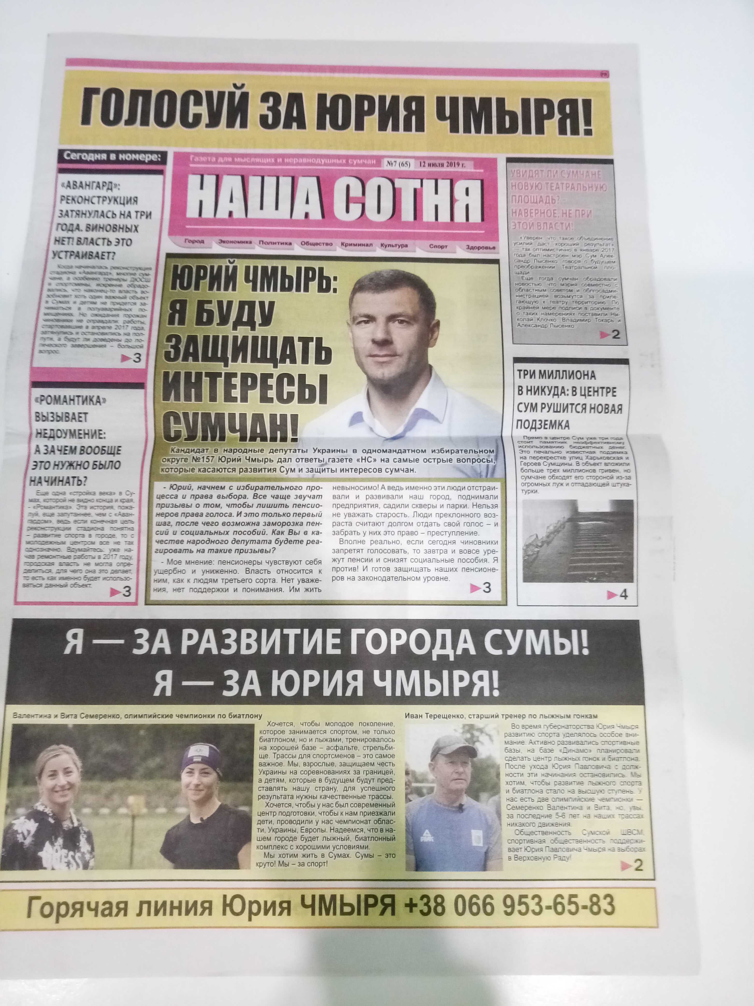 11 липня 2019 року спостерігач від людей, які роздавали агітаційну продукцію кандидата Юрія Чмиря, отримав газету «Наша Сотня». У ній містились матеріали із ознаками замовності та без позначки «Політична реклама». Зокрема, стаття із заголовком «Голосуй за Юрія Чмиря!». Також газета містить матеріал із інтерв’ю кількох сум’ян, які пояснюють, чому саме вони будуть голосувати за колишнього очільника Сумської обласної державної адміністрації. Також деякі матеріали видання містять критику міської влади Сум.