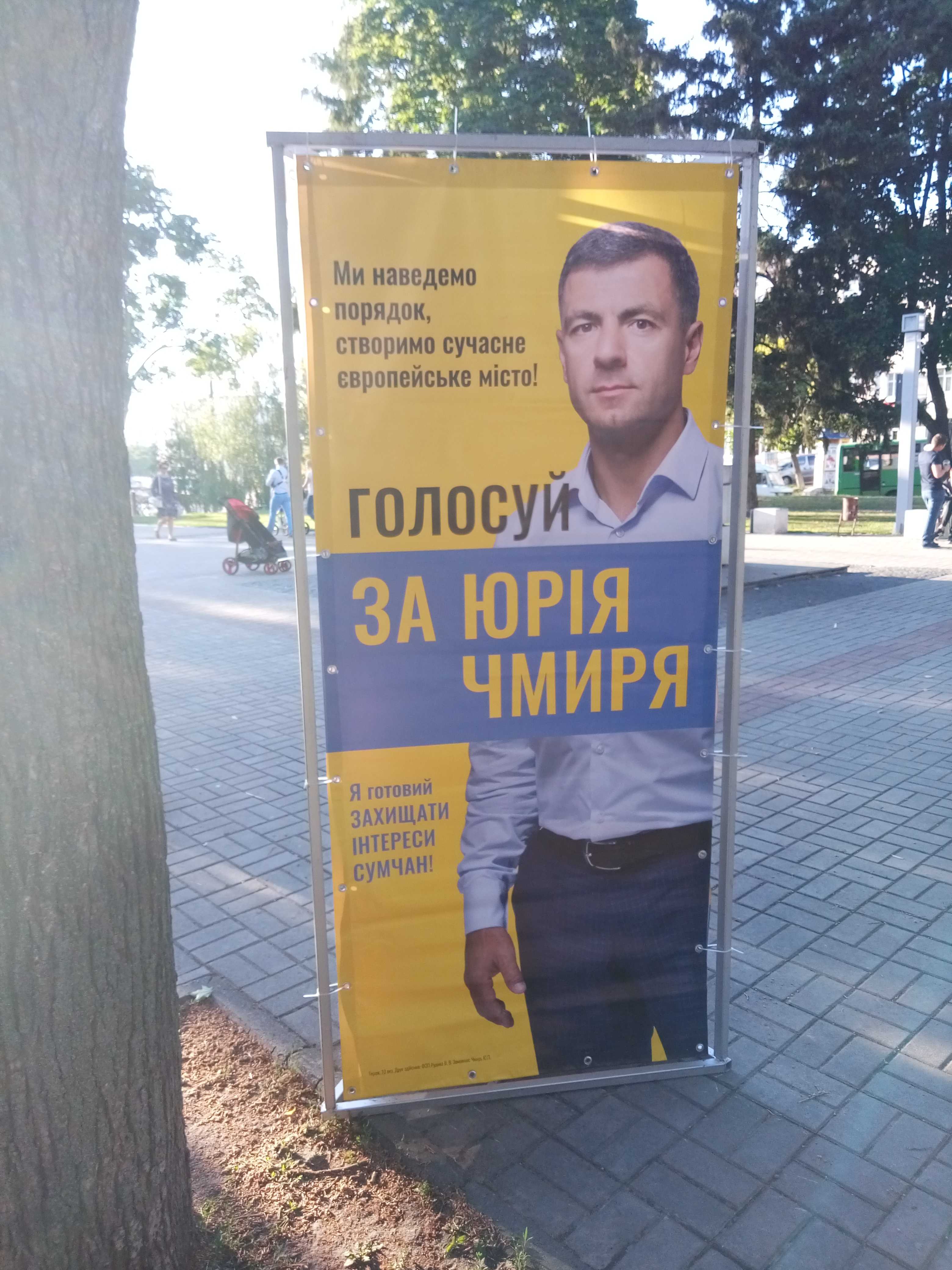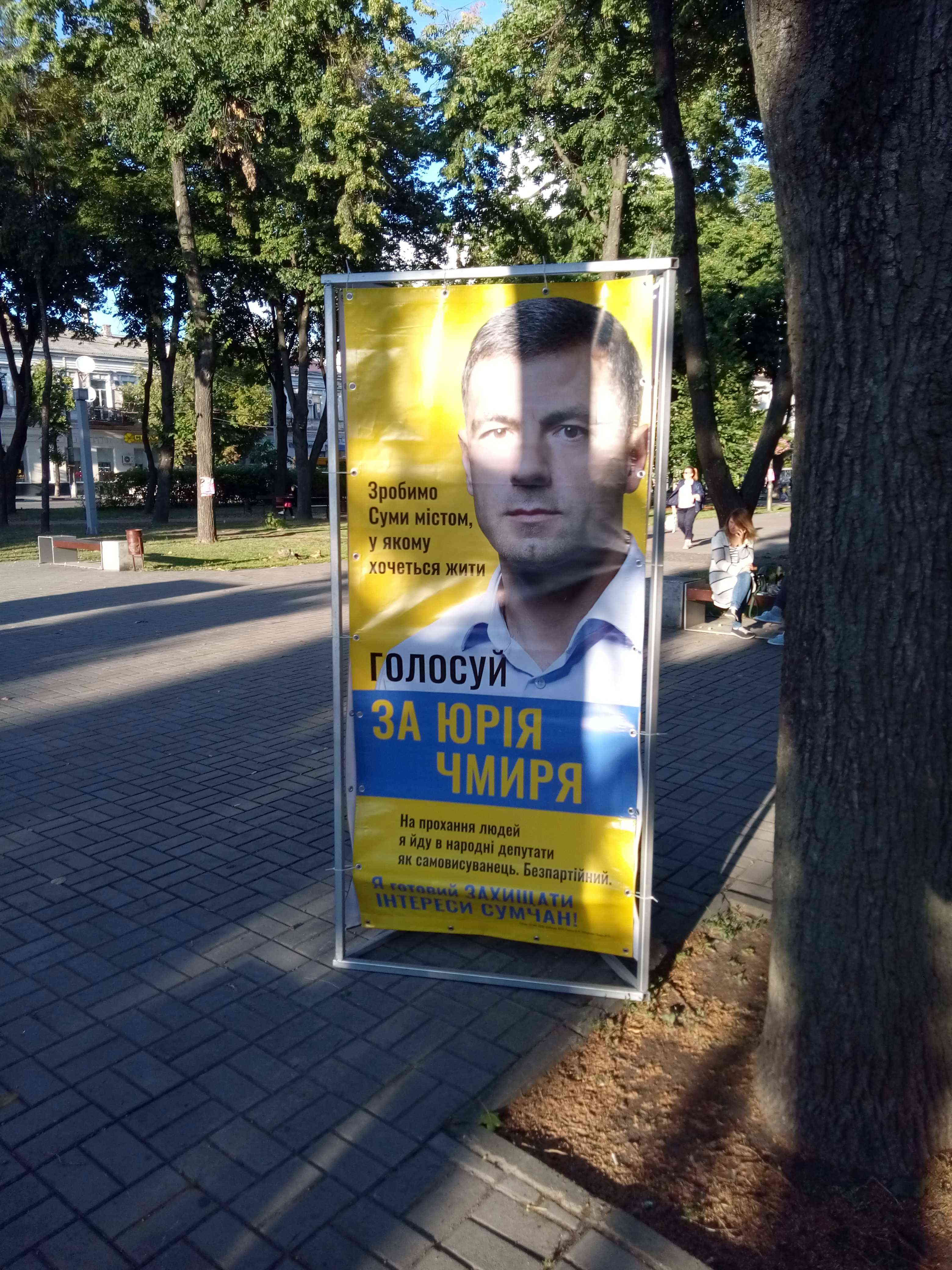 На вулицях міста Суми також розміщено агітаційні матеріали кандидата у народні депутати у 157 виборчому окрузі: білборди, банери. Також розміщені намети кандидата, де поширюють листівки та календарики із зображенням Юрія Чмиря.