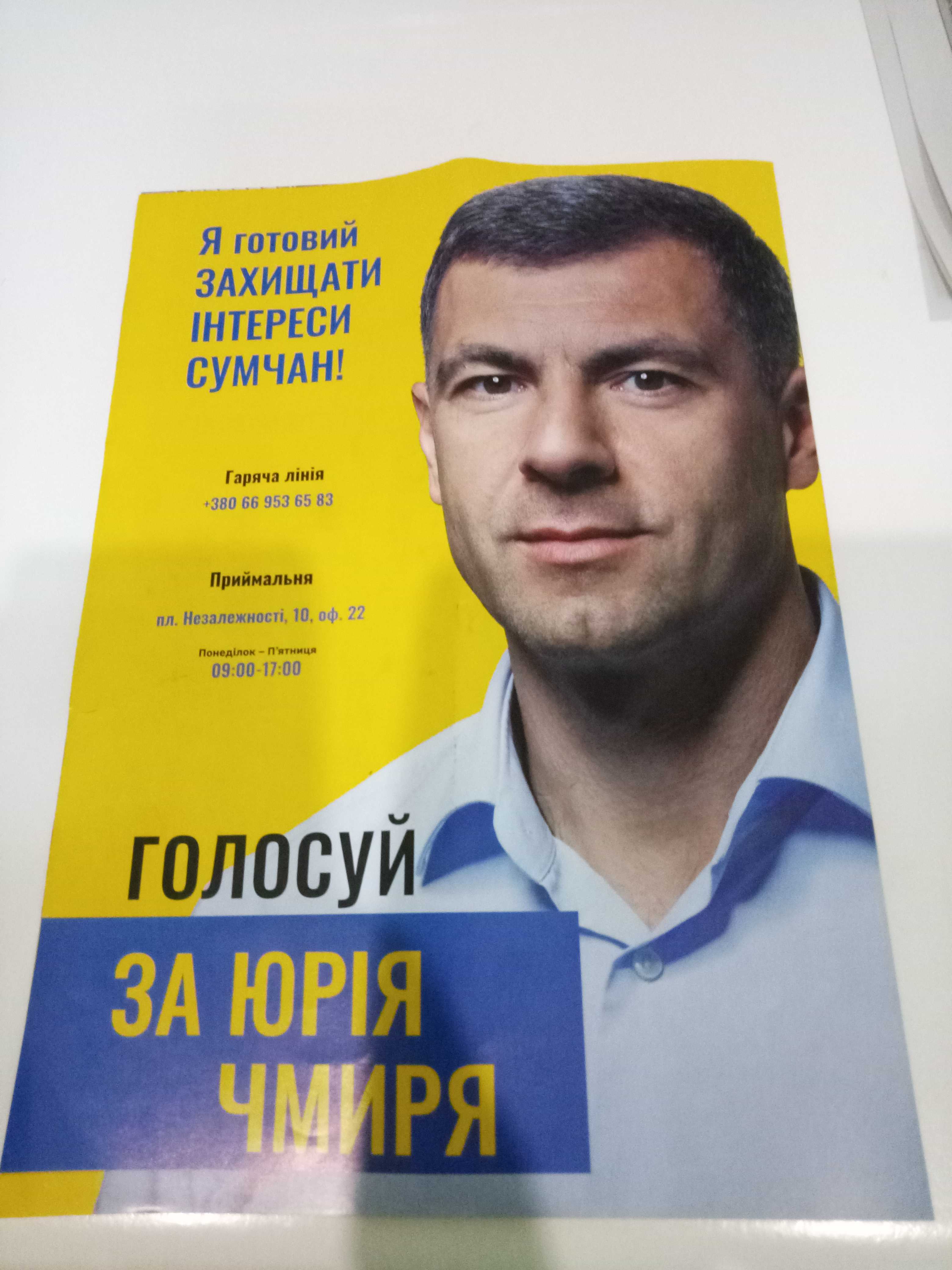 У Сумах люди, які називають себе представниками громадської організації «Sumy - це круто», телефонують людям і говорять про підтримку організацією одного із кандидатів у 157 одномандатному виборчому окрузі Юрія Чмиря (суб'єкт висування - самовисування), а також пропонують долучитися та проголосувати на виборах.