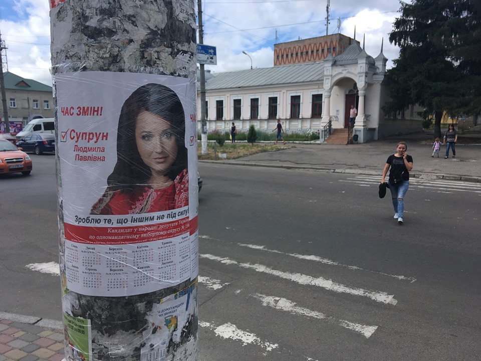 5 липня на площі у центрі міста Сміла (198 виборчий округ) спостерігачі ОПОРИ зафіксували агітаційні листівки кандидата в депутати Юрія Кармазіна, що були розклеєні на електроопорах та дорожніх знаках. 15 липня у Смілі спостерігачі ОПОРИ зафіксували на електроопорах календарі з агітацією кандидатки в депутати за цим округом Людмили Супрун.