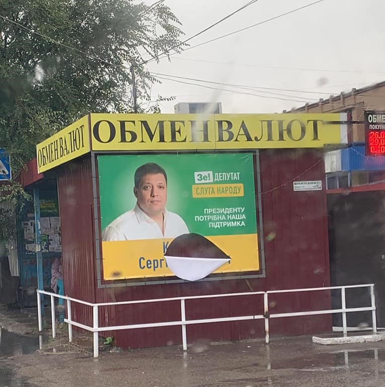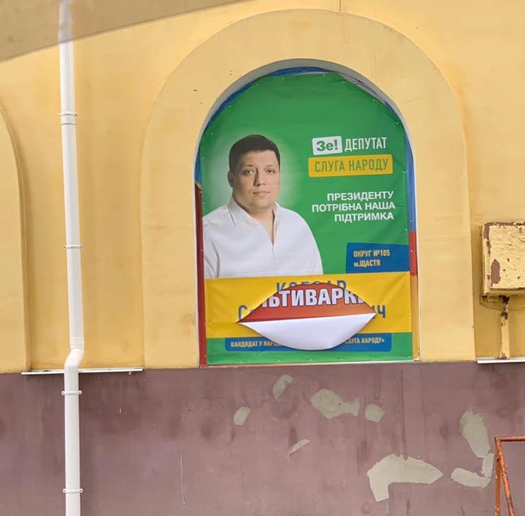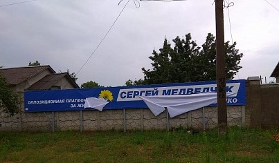 Зокрема, такі дії вчинені стосовно банерів кандидата Сергія Медведчука (балотується від політичної партії «Опозиційна платформа – за життя») та Сергія Кобзаря (суб’єкт висування – політична партія «Слуга народу»). У першому випадку пошкоджений банер з іменем кандидата на синьому фоні поряд із назвою партструктури та її логотипом у вигляді соняшника.