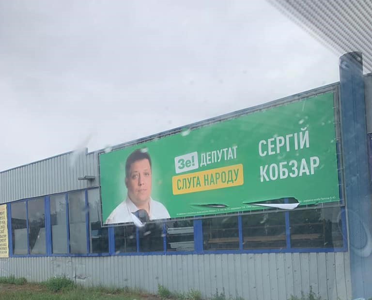 У другому – три банери, виконані у однаковому стилі: прізвище та фото кандидата на палітрі у партійних кольорах з написом «Зе!кандидат. Слуга народу. Сергій Кобзар».