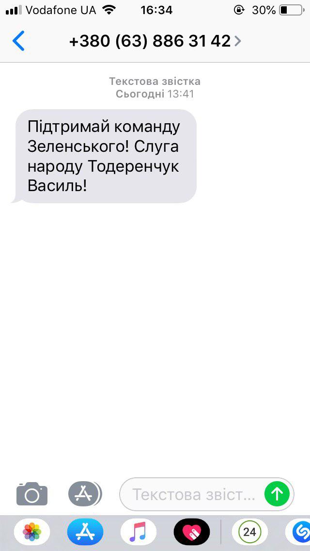 Також 16 липня з невідомого номеру здійснювалася розсилка смс-повідомлень з текстом «Підтримай команду Зеленського! Слуга народу Тодеренчук Василь!»