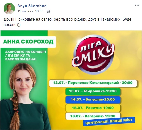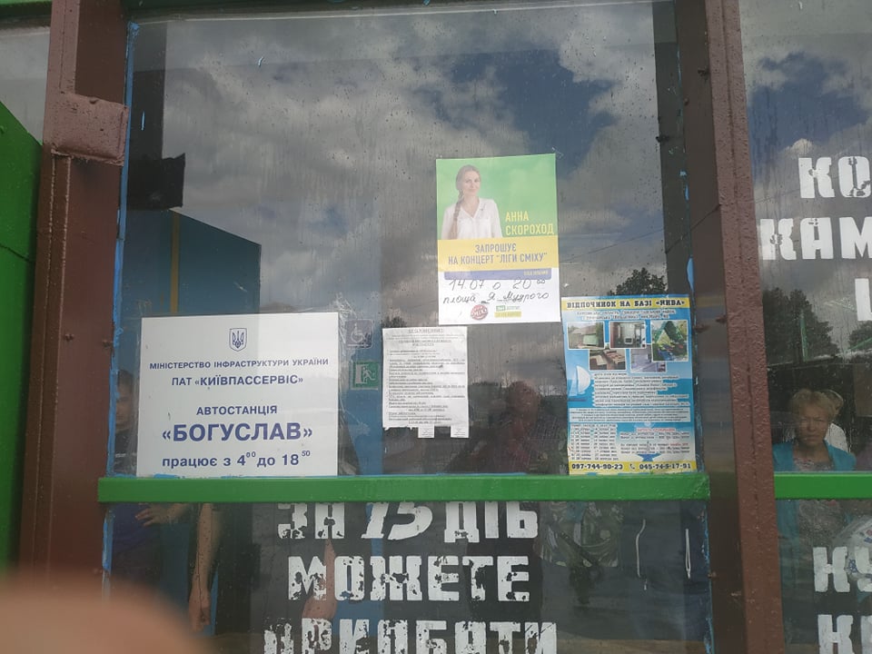 14 липня також у Богуславі відбувся ще один масштабний захід – кандидатка у нардепи по 93 виборчому округу від «Слуги народу» Анна Скороход привезла у місто концерт «Ліги Сміху». Про захід анонсували як у мережі фейсбук, так і афішами, розклеєними по місту. Зазначимо, що одна з афіш у Богуславі  була розміщена на вікні місцевої автостанції. А відповідно до ч.9 ст. 74 Закону України «Про вибори народних депутатів України», розміщення політичної реклами у приміщеннях та на будівлях станцій метрополітену, автобусних та залізничних вокзалів забороняється.