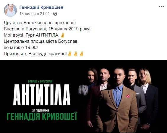 15 липня у місті Богуслав відбувся концерт гурту «Антитіла» на підтримку кандидата у народні депутати у 93 ВО та чинного депутата Верховної Ради Геннадія Кривошеї. Артисти виступали на брендованій сцені з написами «За! Кривошею». Концерт тривав близько двох годин. Окрім пісень, соліст гурту розповідав про знайомство з кандидатом та про його участь у волонтерстві і висловлював йому свою підтримку. Також закликав присутніх «скористатися своїм правом (виборчим), так як відчуваєте». На концерті ходили і люди у брендованих футболках та роздавали присутнім повітряні кульки. Зі сцени виступав і сам кандидат.
