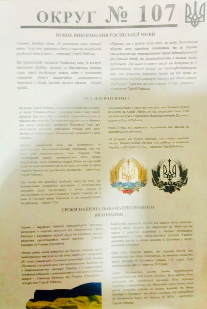 Натомість у 107 виборчому окрузі основною «мішенню» чорних політтехнологій став кандидат-самовисуванець Сергій Рибалка (чинний нардеп, обраний у 2014 році за списками «Радикальної партії Олега Ляшка»). Так, з 15 липня у місті Лисичанську у під’їздах багатоповерхівок можна знайти листівки з його «брендом» - «Сергій Рибалка #1978», у яких йдеться про необхідність повного викорінення російської мови, насильницького національно-патріотичного виховання тощо. При цьому, сам штаб кандидата спростовує інформацію про свою причетність до цієї листівки та заявляє про чергову провокацію з боку політичних опонентів.