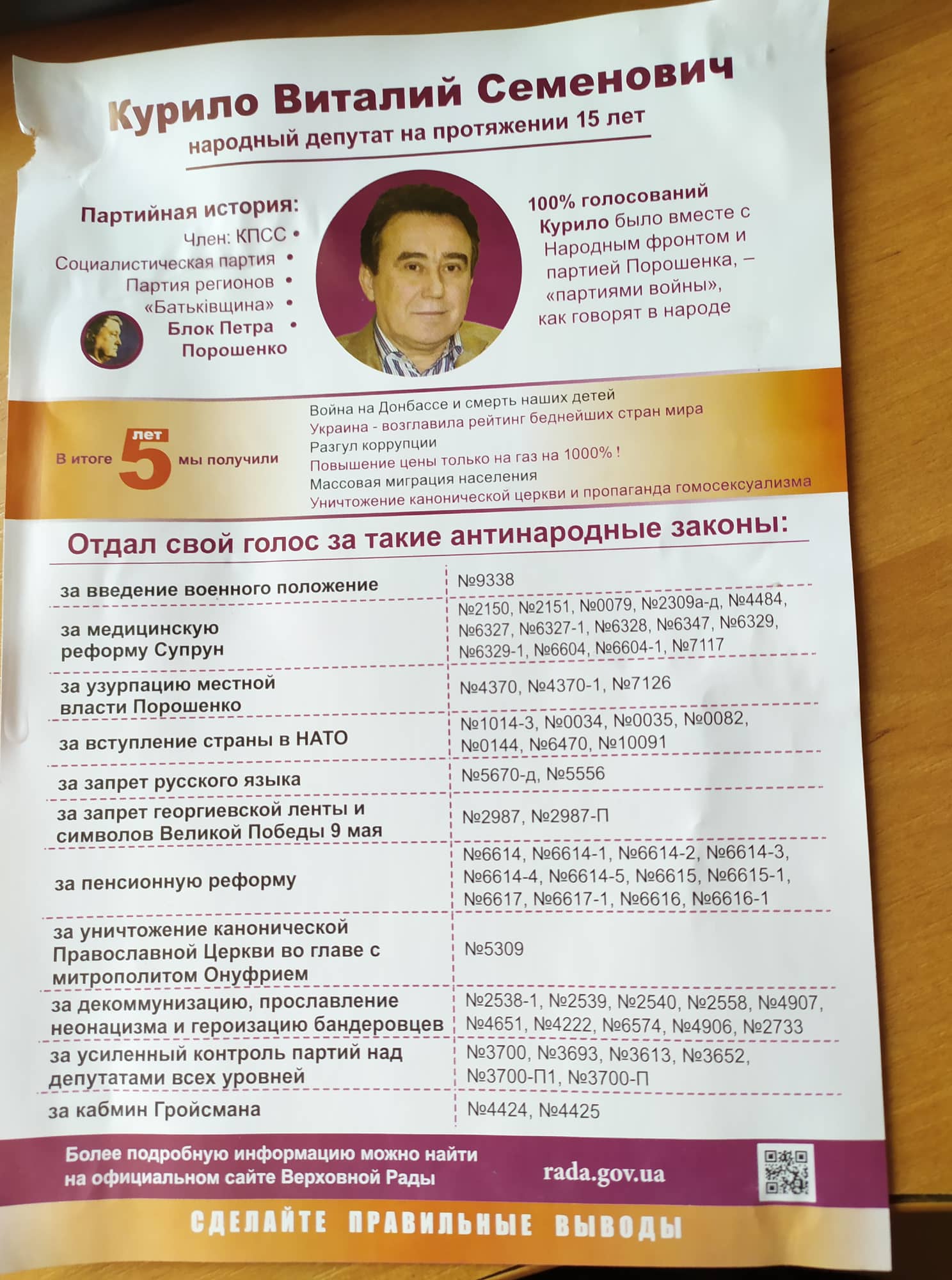 У 113 окрузі об’єктом уваги «чорних політтехнологів» у визначений період став кандидат – самовисуванець Віталій Курило (є чинним нардепом, обраним у цьому окрузі в 2014 році). У населених пунктах, віднесених до 113 виборчого округу у публічних місця масово поширювалися кольорові листівки без вихідних даних «Курило Виталий Семенович. Народний депутат на протяжении 15 лет». Друкована продукція у критичному світлі описує діяльність кандидата у законодавчій гілці влади, зміну партійної приналежності тощо із прикінцевим закликом «Сделай правильный выбор!».