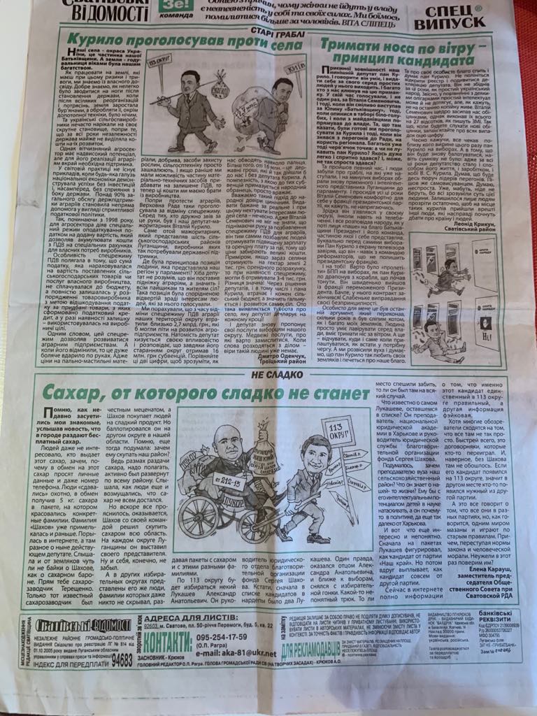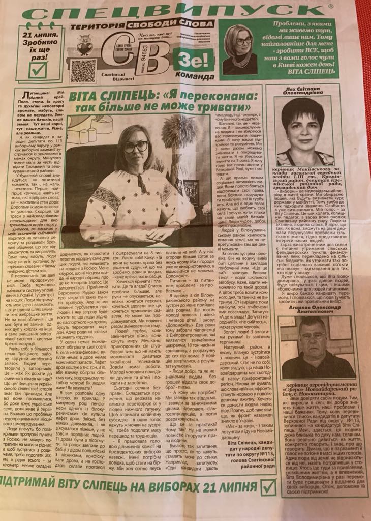 Поряд із цим, у 113 окрузі зафіксовано поширення спецвипуску газети «Сватівські відомості», повністю присвяченого політичній рекламі (з усіма відповідними позначками). 3 сторінки газети складаються із публіцистичних матеріалів на користь кандидата Віти Сліпець (висуванець від партії «Слуга народу»), тоді як остання сторінка присвячена критиці її опонентів у цьому ОВО: вищезгаданому Віталію Курилі (статті «Курило проголосував проти села» і «Тримати носа по вітру – принцип кандидата») та Олександру Лукашеву - висуванцю від «Опозиційної платформи – за життя» («Сахар, от которого сладко не станет». Втім, поряд з усіма необхідними даними, у газеті не зазначені дані її виходу в світ.