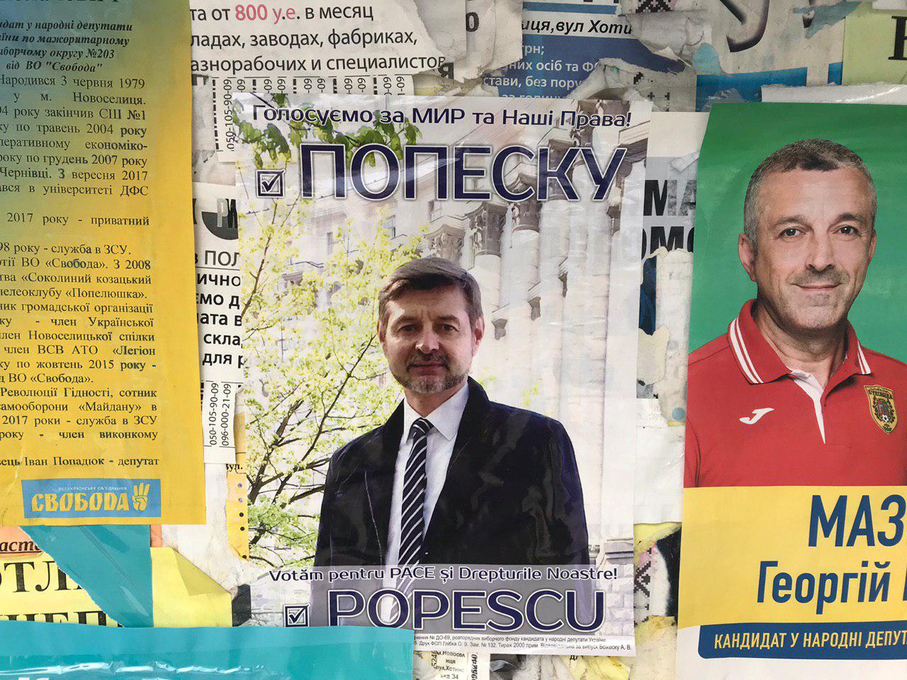 Є поодинокі випадки розміщення плакатів Івана Попеску, самовисуванця, на зупинках та дошках оголошень в населених пунктах округу, однак ці матеріали містять переклад українською мовою.