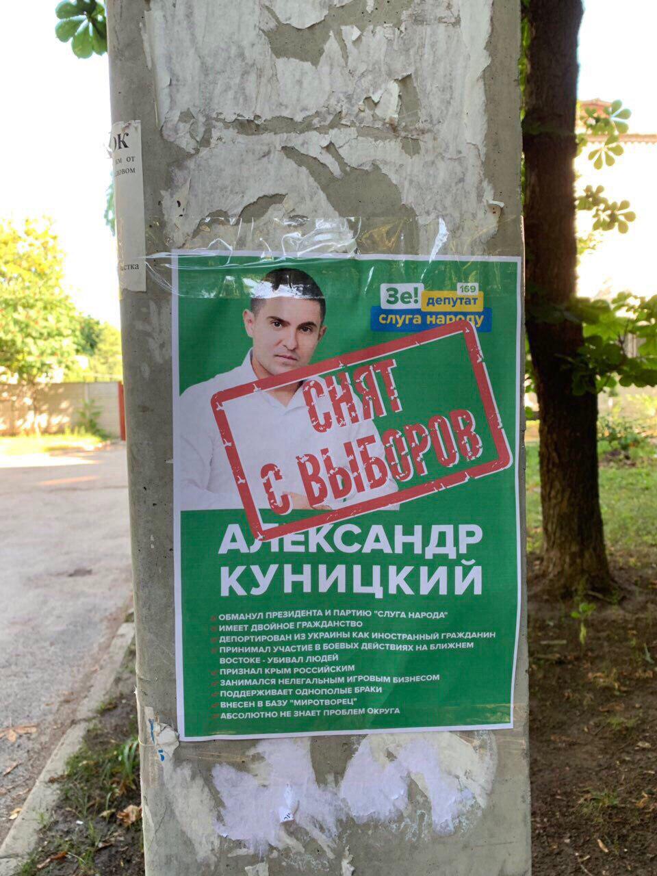 13 липня у 169 виборчому окрузі невідомі розклеїли листівки  з ознаками агітації проти кандидата у цьому ж окрузі Олександра Куницького від партії «Слуга народу». На листівках було написано «Олександр Куницький. Знятий з виборів. Обдурив президента і партію «Слуга народу». Має подвійне громадянство. Визнав Крим російським. Підтримує одностатеві шлюби. Внесений в базу «Миротворець». Брав участь у бойових діях на Близькому Сході — вбивав людей».