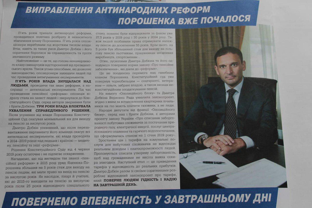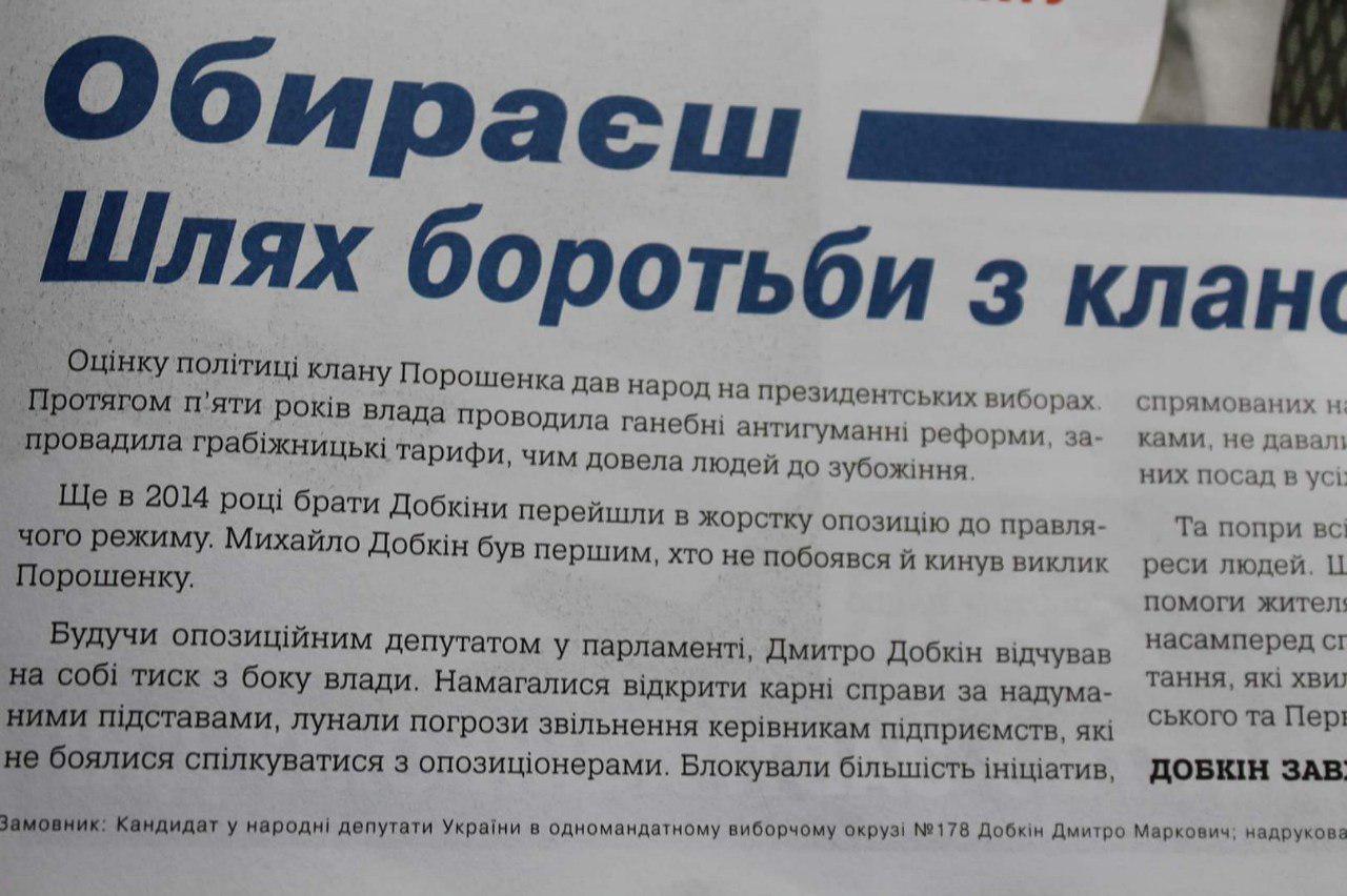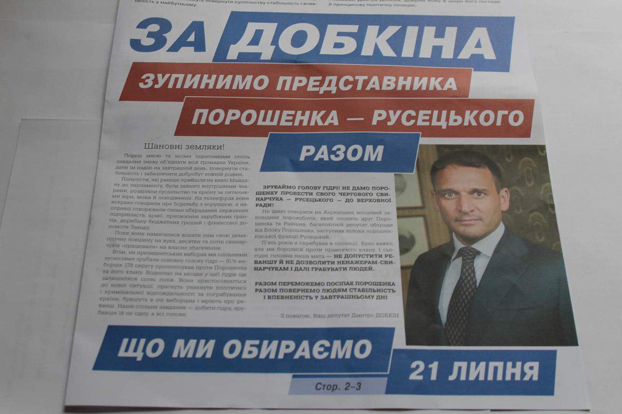 16 липня спостерігачі ОПОРИ виявили, що у 178 окрузі розповсюджували газету «За Добкіна» зі слоганом «Зупинимо представника Порошенко — Русецького». На сторінках газети автори активно описують позитивні досягнення кандидата у 178 виборчому окрузі Дмитра Добкіна (суб’єкт висування політична партія «Опозиційний блок» і в негативному ключі пишуть про Анатолія Русецького (самовисування). В якості замовника цих матеріалів вказаний кандидат Дмитро Добкін.