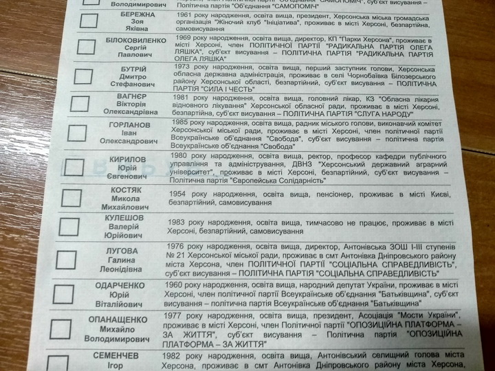 На дільниці №650679 (знаходиться в Херсонському аграрному університеті) навпроти прізвища кандидата в народні депутати в 183-му окрузі Юрія Кирилова (від «Європейської Солідарності») у виборчому бюлетені поставили штамп «Вибув».
