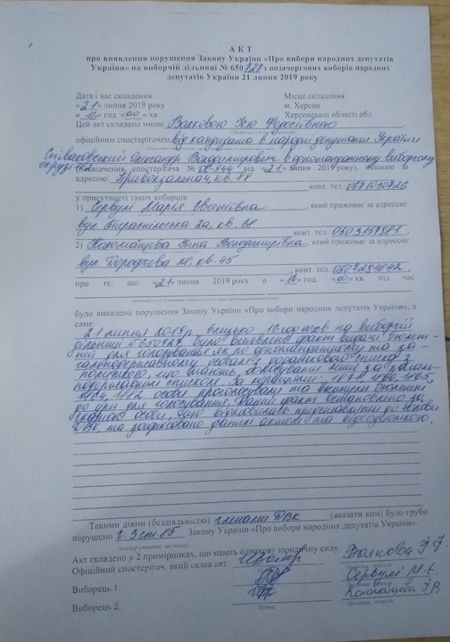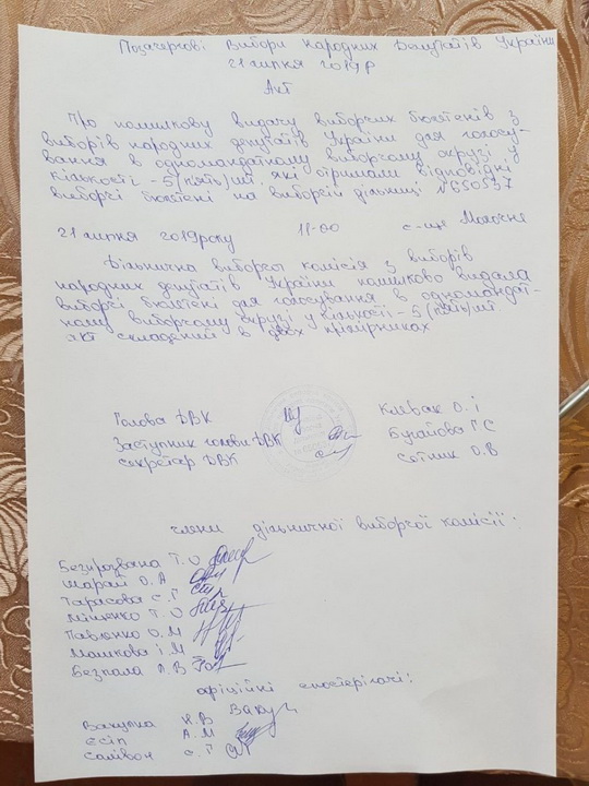 Така ж ситуація на виборчій дільниці № 650727 в 182-му окрузі. Комісія випадково видала 2 бюлетені внутрішньо переміщеній особі. Помітивши помилку, члени комісії склали акт.