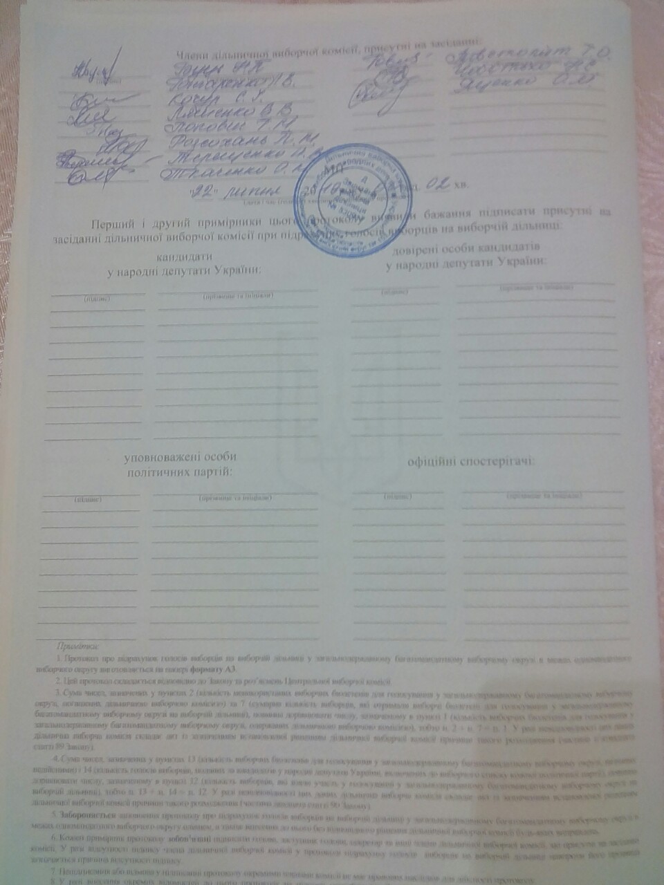 Згідно із частиною 5 статті 91 Закону України «Про вибори народних депутатів України» у протоколах про підрахунок голосів виборців на виборчій дільниці у загальнодержавному окрузі в межах одномандатного округу та в одномандатному окрузі зазначаються дата і час (година і хвилини) його підписання членами дільничної виборчої комісії. Кожен примірник протоколу підписується головою, заступником голови, секретарем та іншими членами дільничної виборчої комісії, які присутні на засіданні виборчої комісії. Член дільничної виборчої комісії, присутній на засіданні дільничної виборчої комісії, зобов'язаний підписати протокол про підрахунок голосів виборців на виборчій дільниці.