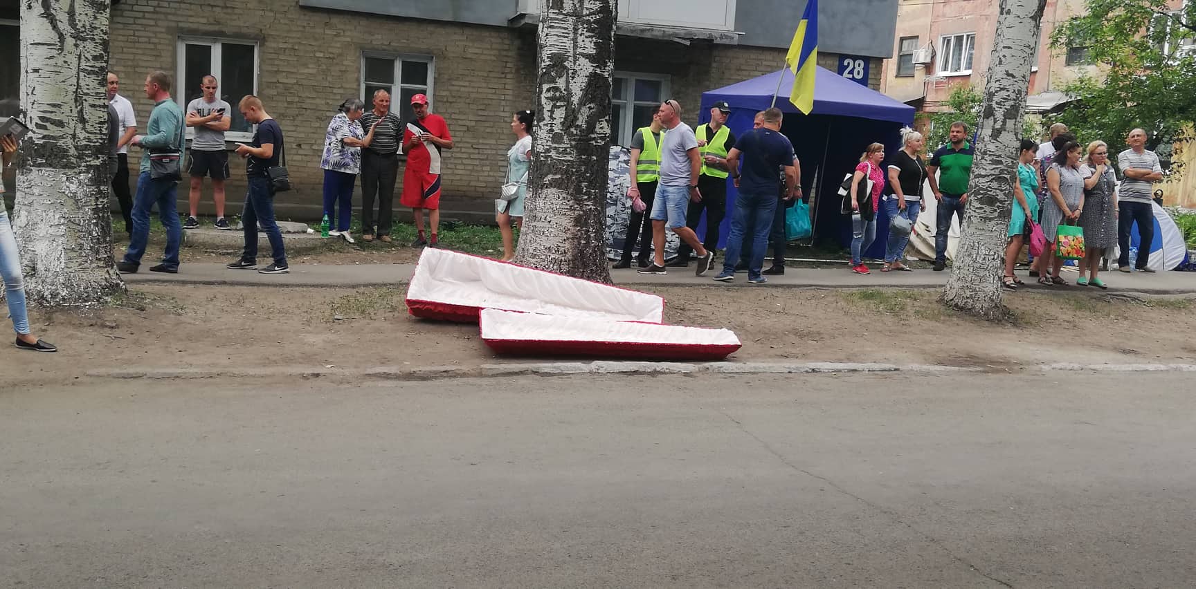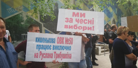 У приміщенні ОВК присутні троє кандидатів – самовисуванець Андрій Аксьонов, висуванка від Слуги народу Тетяна Романцова та висуванець від «Опозиційного блоку» Руслан Требушкін. Біля ОВК зібралась група мітингувальників. На транспарантах які тримають мітингувальники містяться лозунги: «Кишенькова ОВК працює виключно на Руслана Требушкіна», «Ми за чесні вибори» та «Зупиніть свавілля на ОВК».
