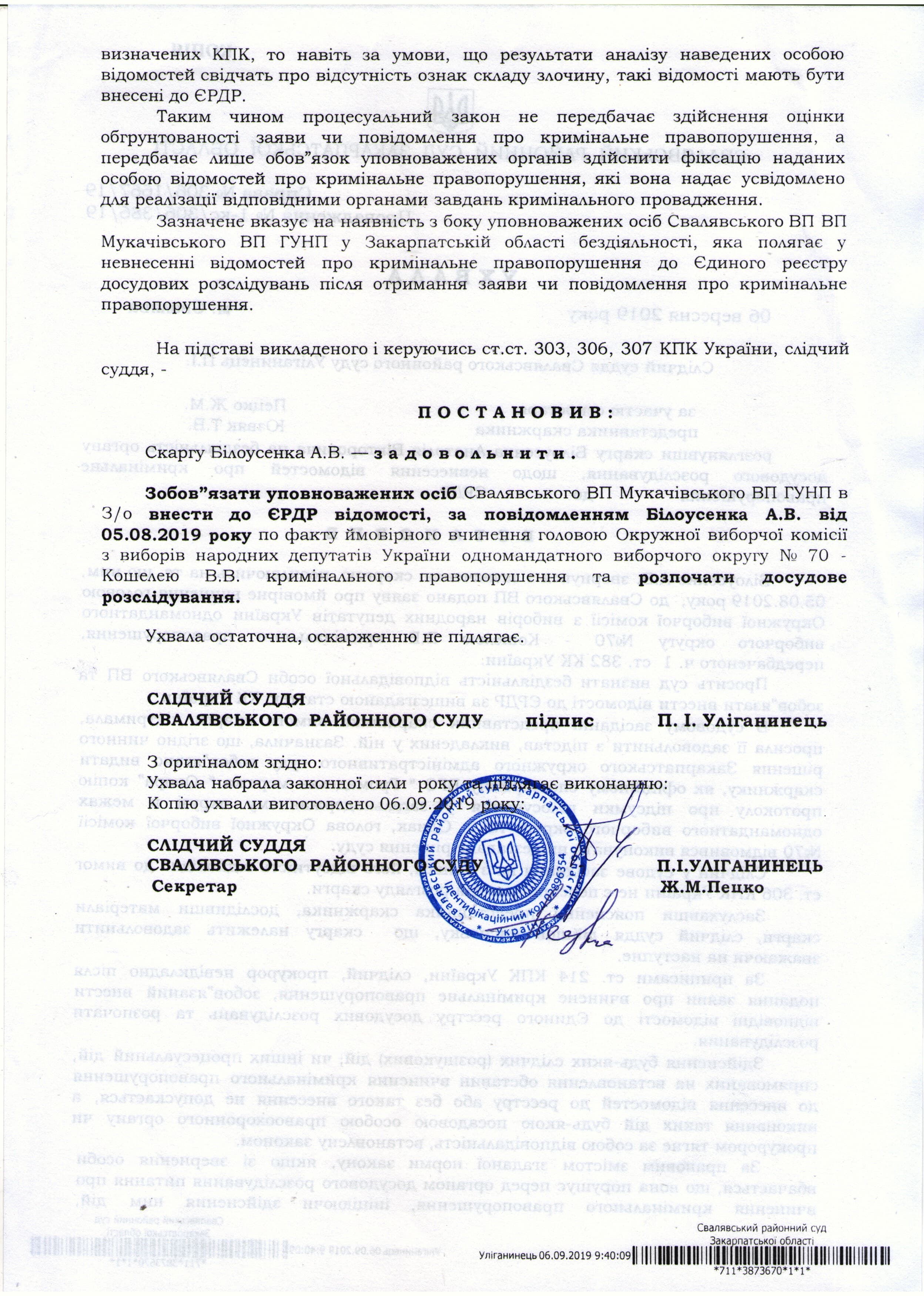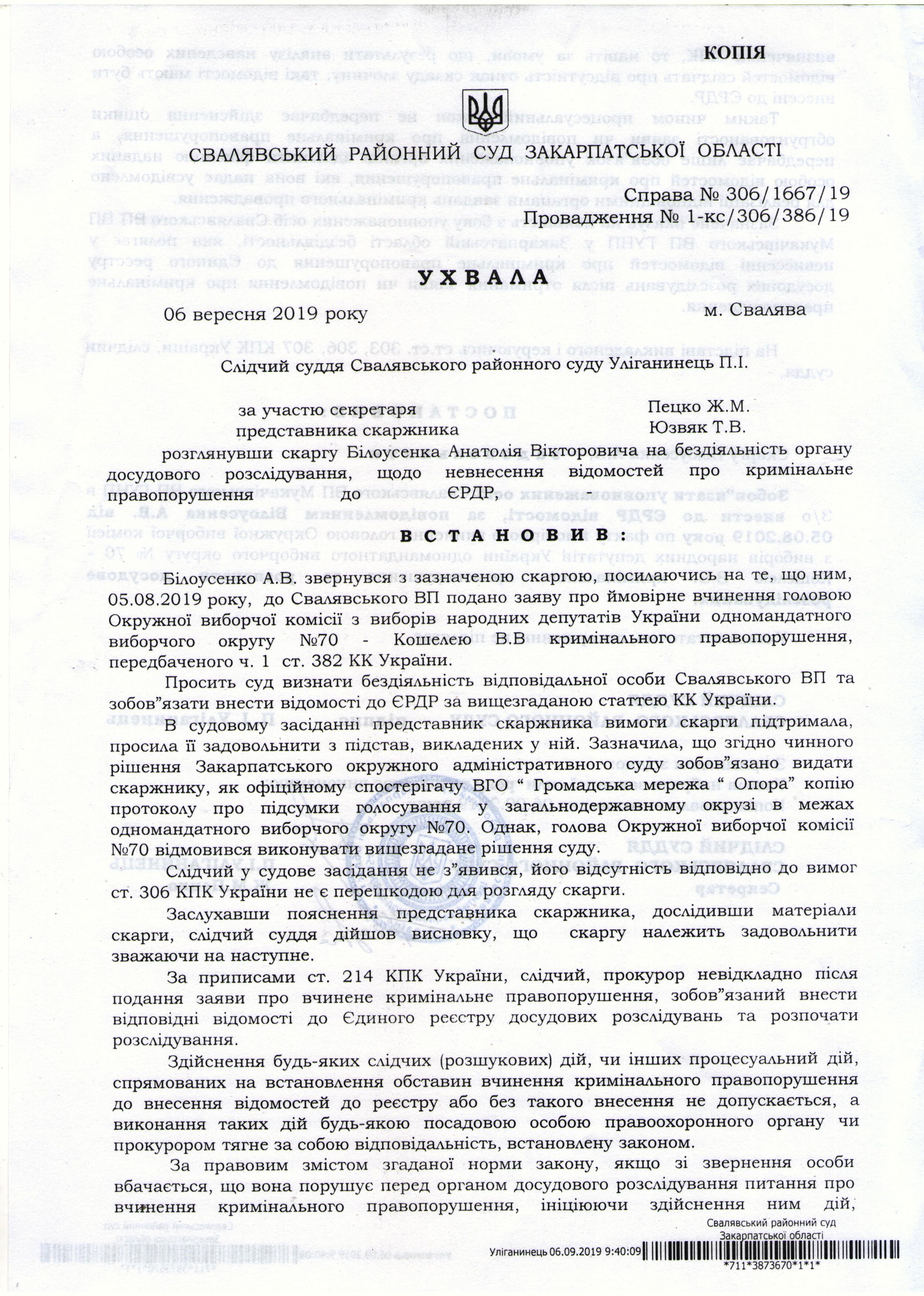 Слідчий суддя Свалявського районного суду задовольнив скаргу спостерігача ОПОРИ на те, що поліція зволікає із відкриттям кримінального провадження за заявою цього спостерігача щодо невиконання судового рішення про видачу ОВК протоколу підрахунку голосів. Відтак закарпатська поліція повинна розпочати досудове розслідування та встановити всі обставини цієї справи.