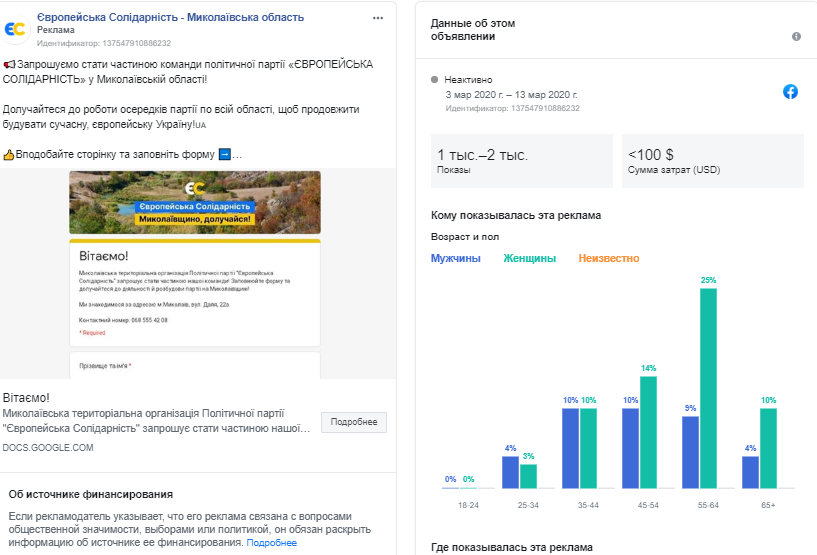 На рекламу за останній місяць витрачала і політична партія “Європейська солідарність”. Рекламне оголошення було запущено 3 березня і стосувалось пошуку нових членів команди політичної партії. Загальна кількість охоплених мешканців області могла доходити до 2 тисяч осіб.